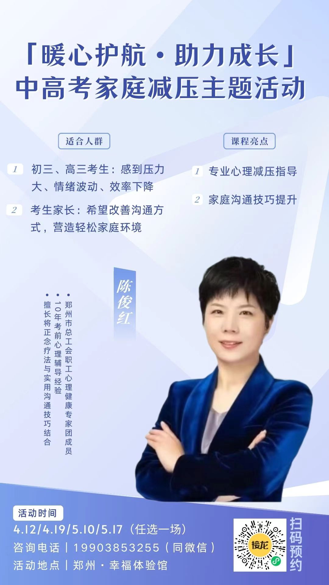 中高考不仅是学子们的“人生大考”,更是对家庭心理支持的考验!为帮助考生缓解焦虑、优化备考状态,同时指导家长营造温暖积极的家庭氛围,郑州市总工会特别推出公益减压活动,由资深心理专家带领家庭掌握科学减压方法,助力学子轻装上阵!