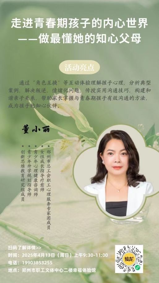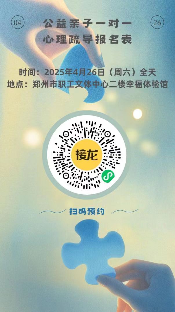 倾听亲子心语,共筑和谐家庭。每个月最后一个周末为郑州市总工会幸福体验馆职工公益亲子咨询日,请有需要咨询的职工朋友们提前预约,并和孩子一同前往,让我们共同打开心扉,建立温馨和谐的亲子关系!