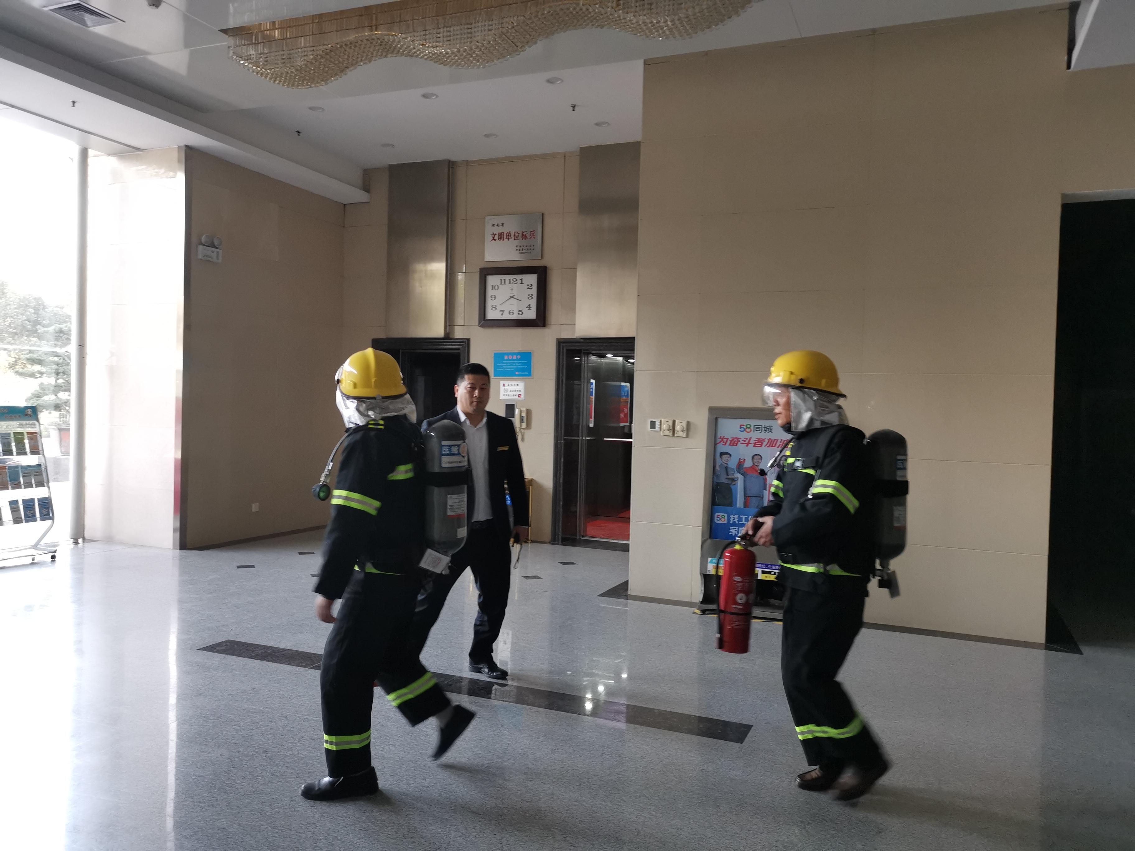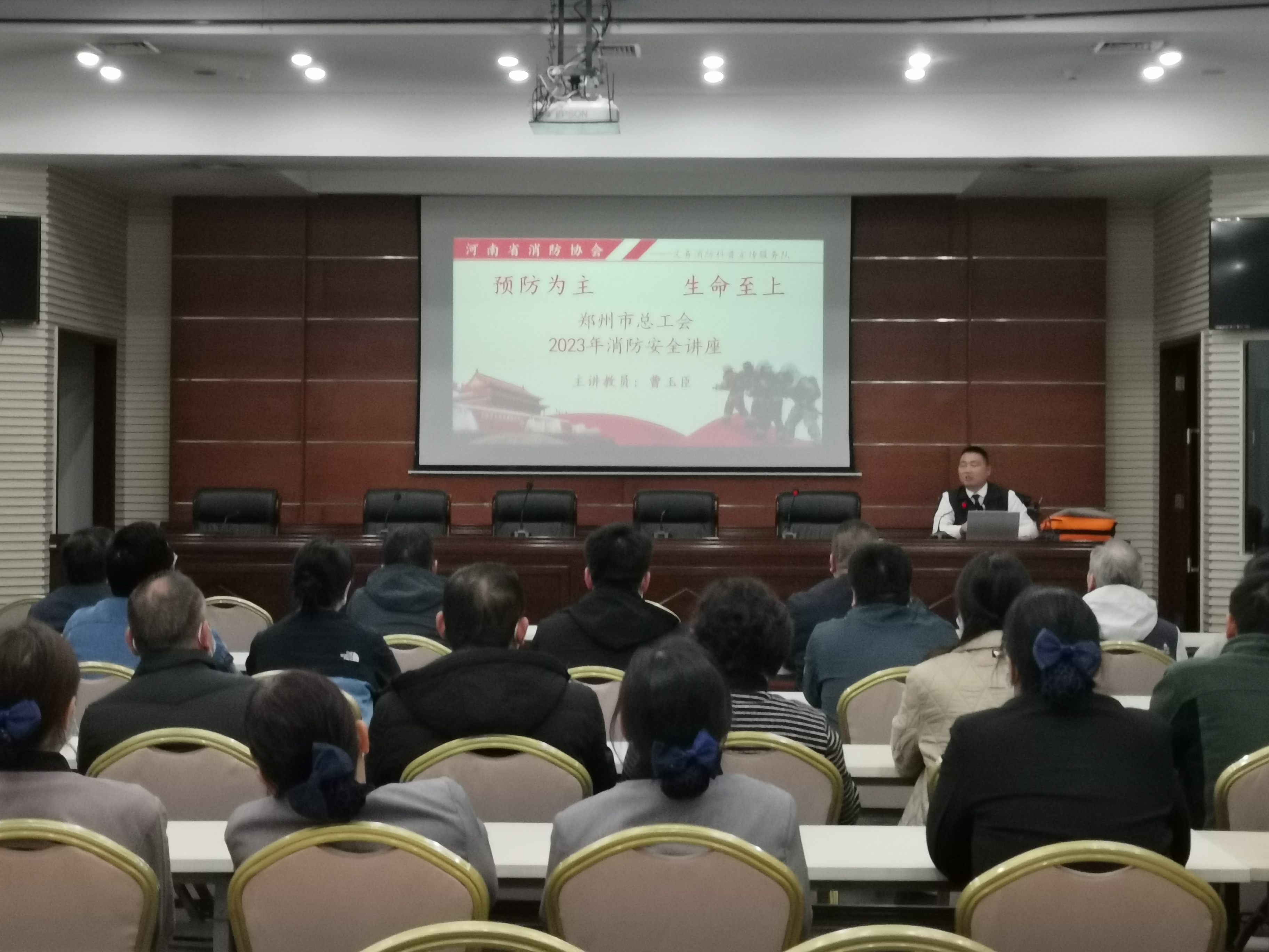 首先,河南省消防协会义务消防科普宣传服务队的曹玉臣教员对全体人员进行消防知识专业讲解。曹教员结合现阶段灾害形势及近年来发生的灾害事故,利用通俗易懂的语言,详细讲解消防器材的使用和日常维护基本知识,传授火场逃生基本技能、火灾报警、防火灭火基本常识以及紧急疏散的注意事项。