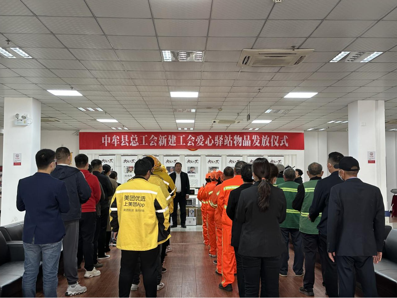 3月7日上午,中牟县总工会在一楼北大厅举行新建工会爱心驿站物品发放仪式,为外卖、快递、环卫、园林等群体发放了微波炉、医药箱、饮水机等爱心物品。