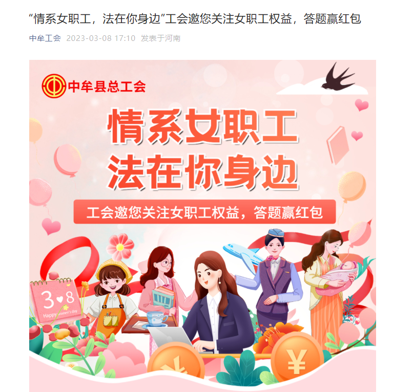 四是开展线上法律法规知识竞答活动。利用中牟工会微信公众号开展“情系女职工,法在你身边”答题赢红包活动,活动重点宣传了《工会法》、《妇女权益保护法》、《河南省女职工劳动保护特别规定》等法律法规知识,3800余人次参加了此次活动,极大提高了全县职工法律知识学习氛围和法治意识,受到职工们的一致好评。