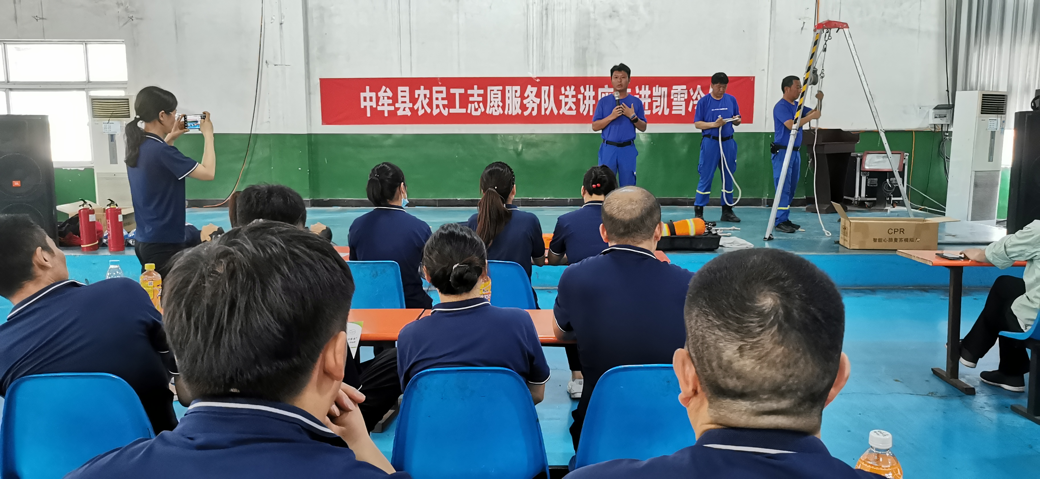 培训中,中牟县优秀农民工志愿者通过列举具体典型事例和现场实操等方式,详细为大家讲解了面对不同突发事件该如何应对与处置,同时,手把手教学,现场组织职工操作各种器材,通过互动教学进一步增强应急救护知识培训效果。