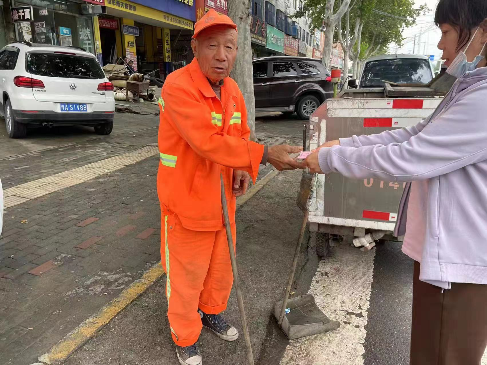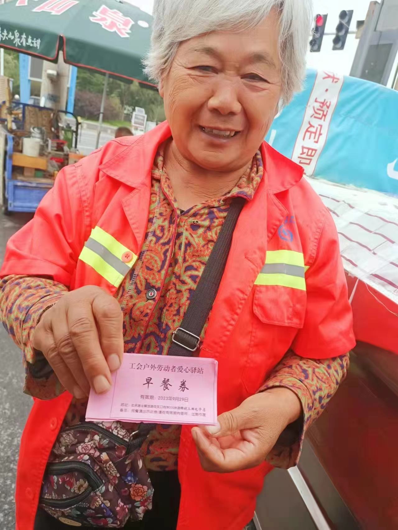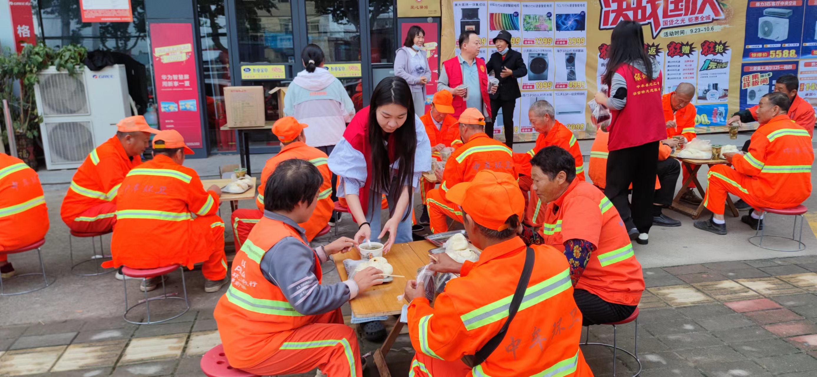 环卫工人在最平凡、最普通的工作岗位上顶酷暑,冒严寒,使环境更加优美,城市更加整洁,他们因为早起且工作忙碌,普遍存在“早餐难”问题。9月27日清晨,忙完工作的环卫工陆陆续续来到爱心驿站,工会志愿者和驿站工作人员根据他们的口味和需求,把一份份热气腾腾且营养美味的早餐送到他们的面前,感谢他们为城市建设和美化所付出的辛苦劳动,并为他们送上节日的祝福。