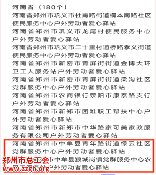 近日,全国总工会发布2023年“最美工会户外劳动者服务站点”(以下简称最美驿站)名单,中牟县青年路街道绿云社区党群服务中心户外劳动者爱心驿站、狼城岗镇党群服务中心农民工服务站户外劳动者爱心驿站2个站点被评为“最美驿站”,截至目前,我县共有7个站点获此殊荣。