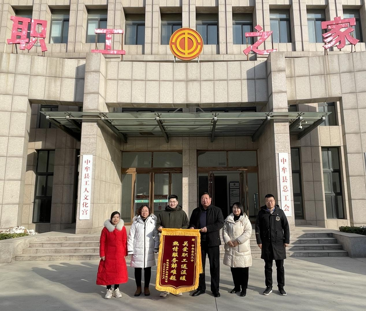 12月20日上午,中牟县官渡镇工业园区博凯健康产业有限公司工会主席盛三辈一行来到县总工会,送来一面“关爱职工送温暖 热情服务解难题”的锦旗,代表企业220余名会员对县总工会助力企业发展、保障职工权益的一系列举措和行动表达了由衷的感谢。县总工会党组成员、副主席姬洪利接受锦旗。
