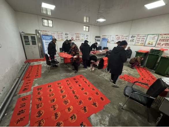活动现场,在西周庄村委会,几张书桌一字排开,桌上的红纸笔墨和镇纸也一一摆好。书法家们屏心静气,铺开纸张,挑选对联,然后挥毫泼墨,整个过程非常娴熟老道,把对新春的期望和祝福全部融入笔墨间。他们或是现场自由发挥,或是应群众的要求“量身订制”。志愿者和工作人员在一旁忙着将写好的一副副火红的春联进行晾干,现场一派欢乐祥和的气氛。