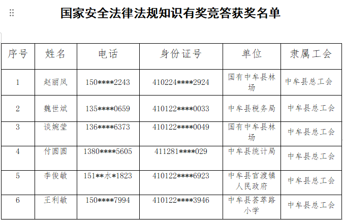 活动开展以来,中牟县总工会高度重视、精心组织,广泛动员各行各业职工群众积极踊跃参与。经过市总工会评选,我县共有6名职工在此次活动中获得优秀奖,奖品为夏凉被一份,在此,县总工会对获奖职工表示衷心地祝贺,请获奖者持本人身份证到县总工会职工服务中心领取奖品。