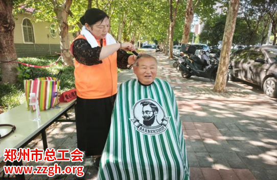爱心义剪区:理发师支起椅子,为环卫工人和老人免费理发。“天热,剪短点更凉快!”环卫工魏阿姨摸着新发型满意地说。