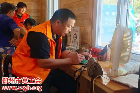 家电维修区:志愿者聚精会神地检修电风扇、电水壶等小家电。“天气热,电风扇坏了可不行!”马纯亮一边拧螺丝一边说。