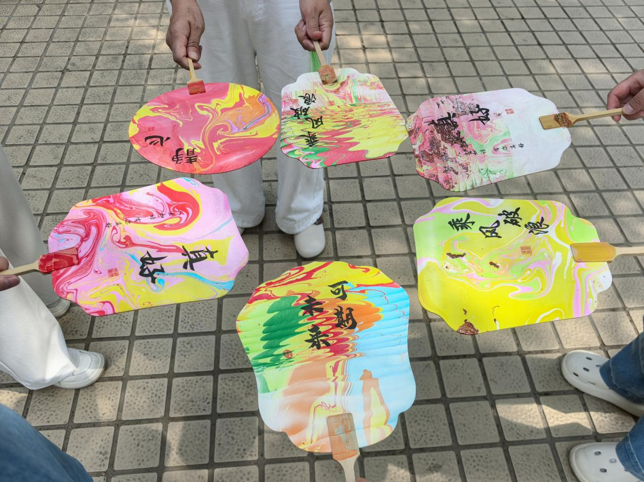 活动伊始,工作人员为参与者们讲解了漆艺的发展脉络,漆扇制作的技巧要点。到了体验环节,在工作人员细心指导下,大家手持空白扇面,将大漆颜料滴入水中,通过轻轻搅动水面,使颜料形成独特的纹理图案。随后,将扇面侵入水中,让色彩自然附着在扇面上,通过不断调整扇面转动的角度让漆色随着水流自然附着在扇面上,由此一幅幅诗情画意的漆扇作品便呈现在大家眼前。