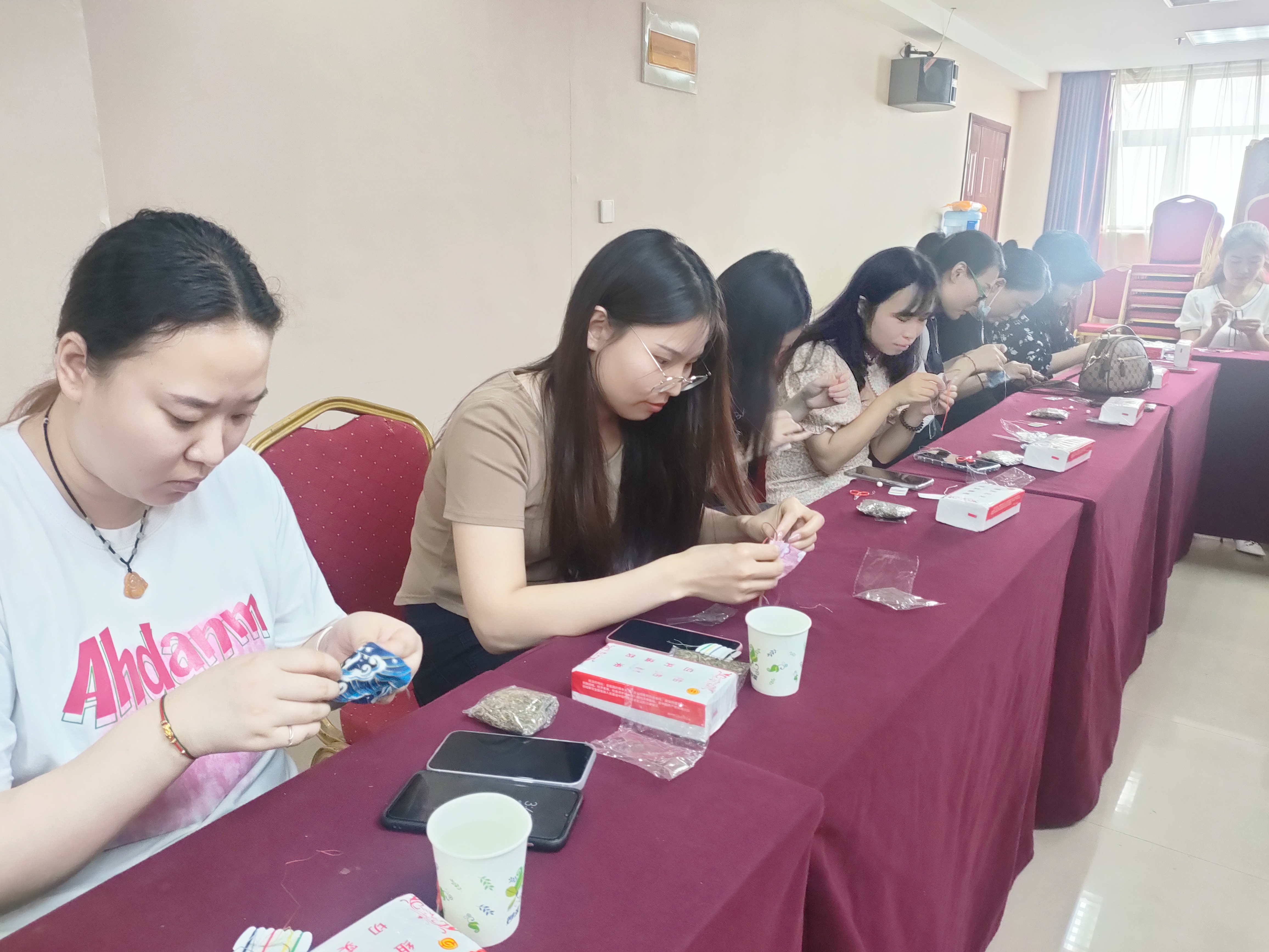 随后,就到了本次活动的手工环节——缝制香囊。活动现场,给大家准备了各式各样花色的香囊布料,不同味道的香料以及各种流苏、珠子、彩色针线等材料。职工们跟着社工的讲解,开始一步一步的进行制作,大家飞针走线,五颜六色的布料、丝线、香料共同交织出一幅节日氛围浓厚的文化绘卷。香囊承载着民族传统文化,大家在制作中不断感受到传统文化的魅力。