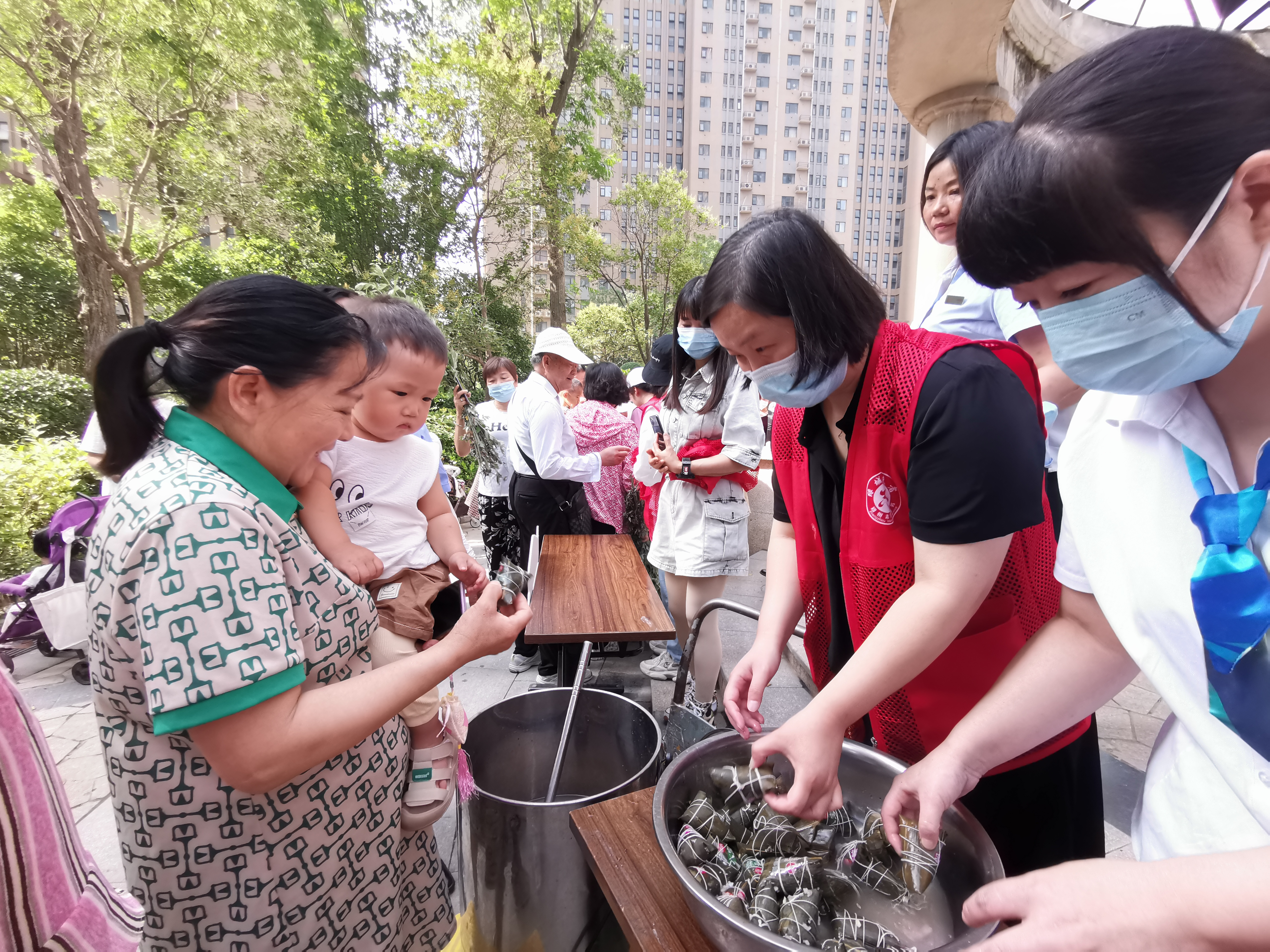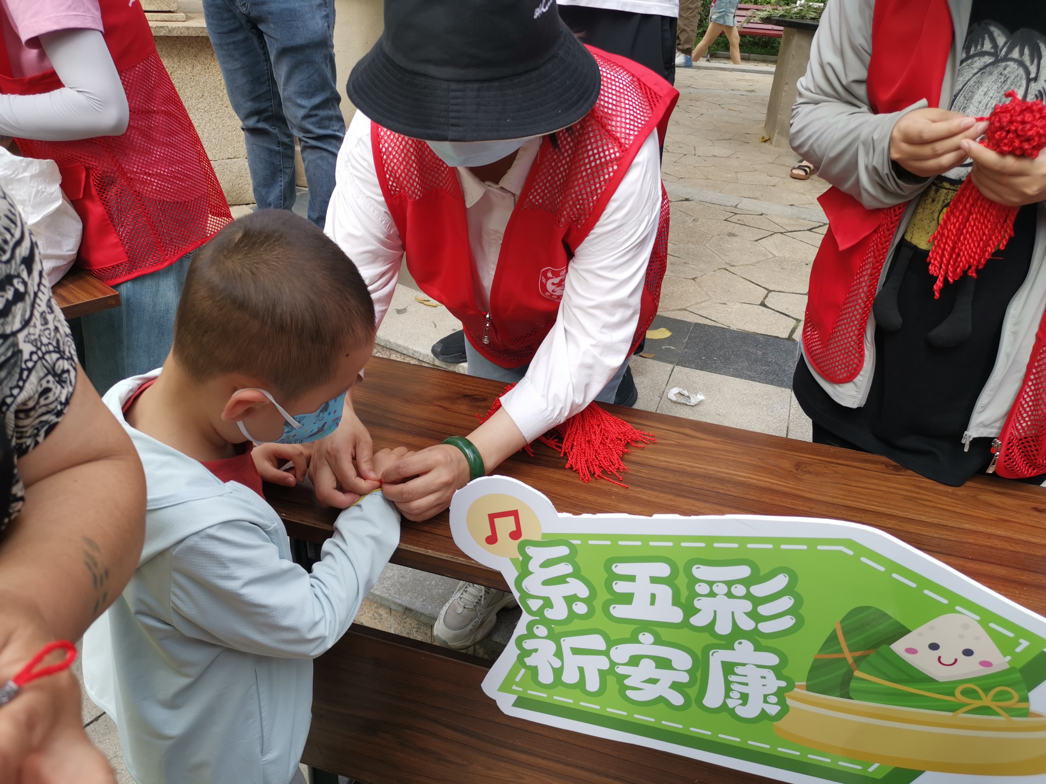 孩子们在志愿者的帮助下,系上了红绳,一个一个喜笑颜开,现场热闹非凡,吃粽子、选香囊、话端午、传粽情。热闹的端午节已经化身为幸福的“邻里节”。