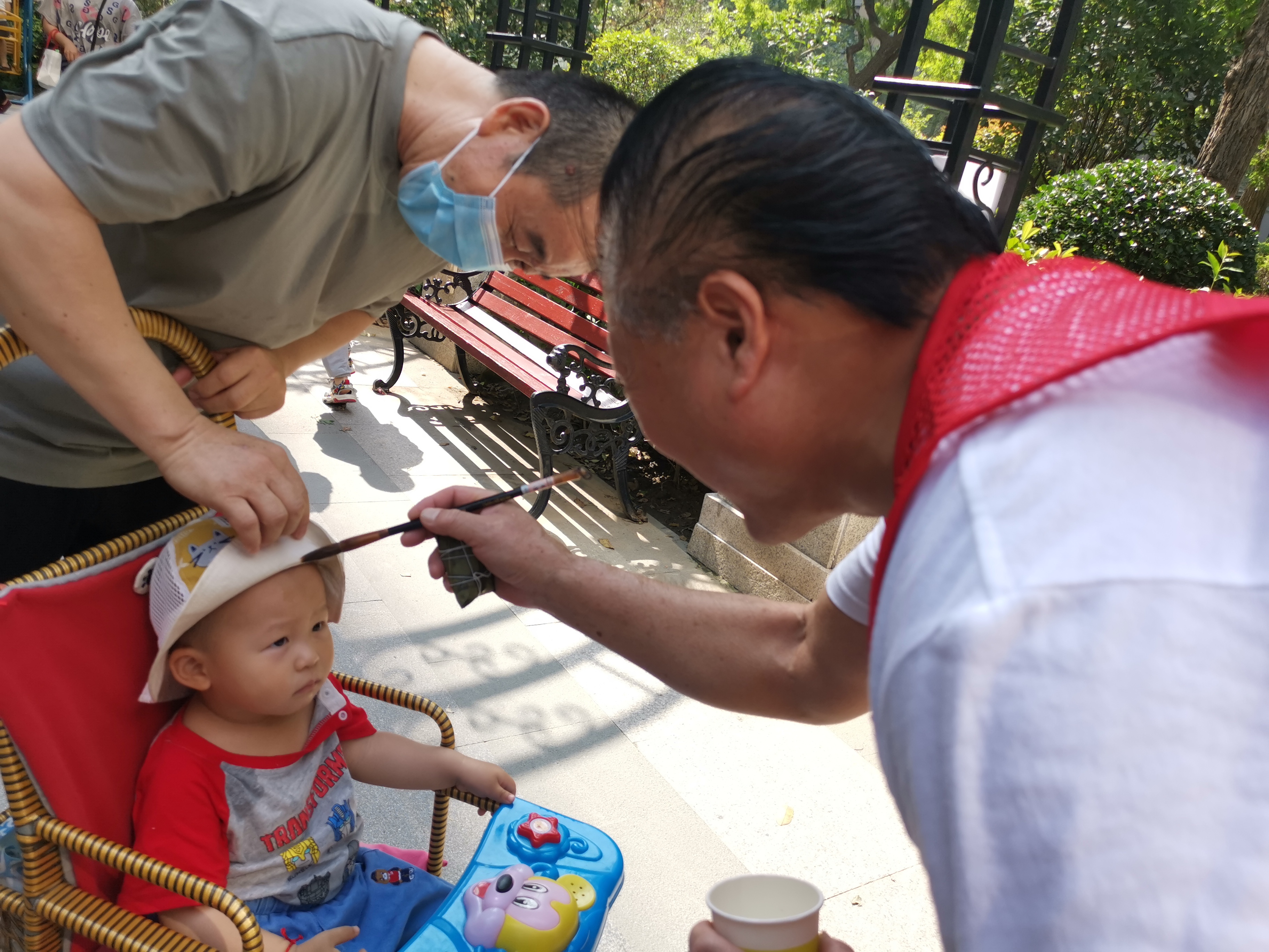 在一张贴着“点了雄黄酒,病魔都远走”标语的桌子前,一位社区的志愿者拿着毛笔为孩子轻轻点上雄黄酒,为孩子祈福纳吉、驱魔辟邪,送上深深地祝福。