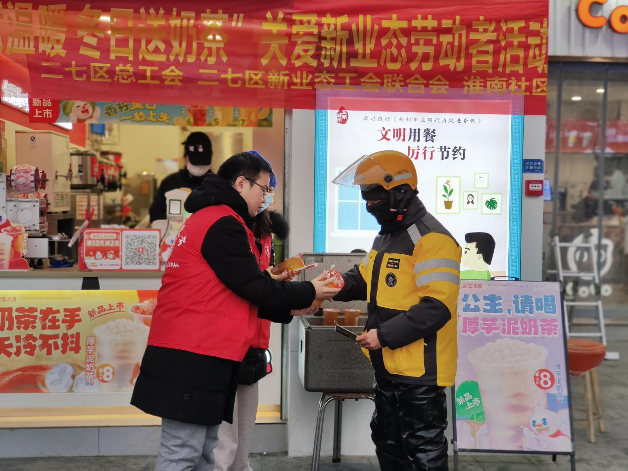 12月14日下午,二七区总工会、建中街街道淮南社区工会联合蜜雪冰城(二七升龙店)开展“严寒献温暖 冬日送奶茶”活动。