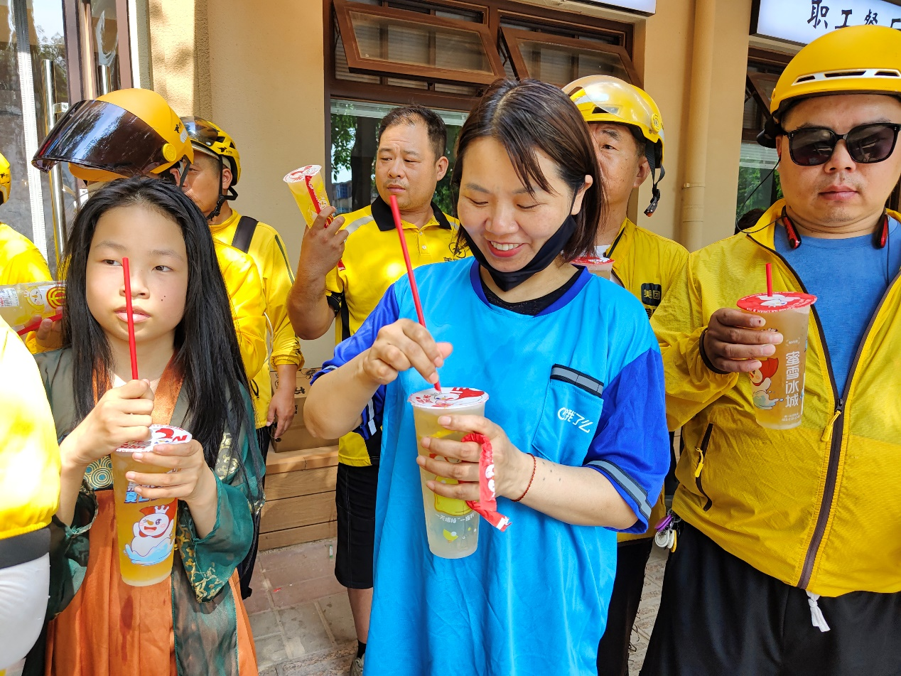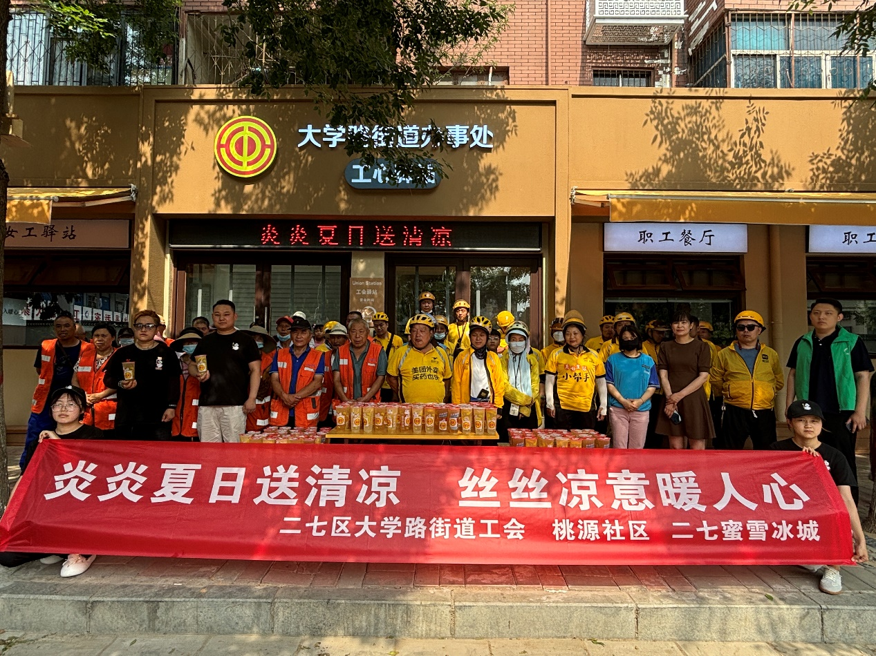 酷暑盛夏,热浪滚滚。随着夏季高温的持续,城市中的新业态劳动者、环卫工人等户外劳动者面临着热浪挑战。为了让他们在炎炎夏日感受到一丝清凉,昨日,二七区大学路街道工会联合蜜雪冰城在工心驿站开展“炎炎夏日送清凉 丝丝凉意暖人心”送冷饮活动,为骑手、快递小哥、环卫工人、网格长等群体免费发放150份冷饮。