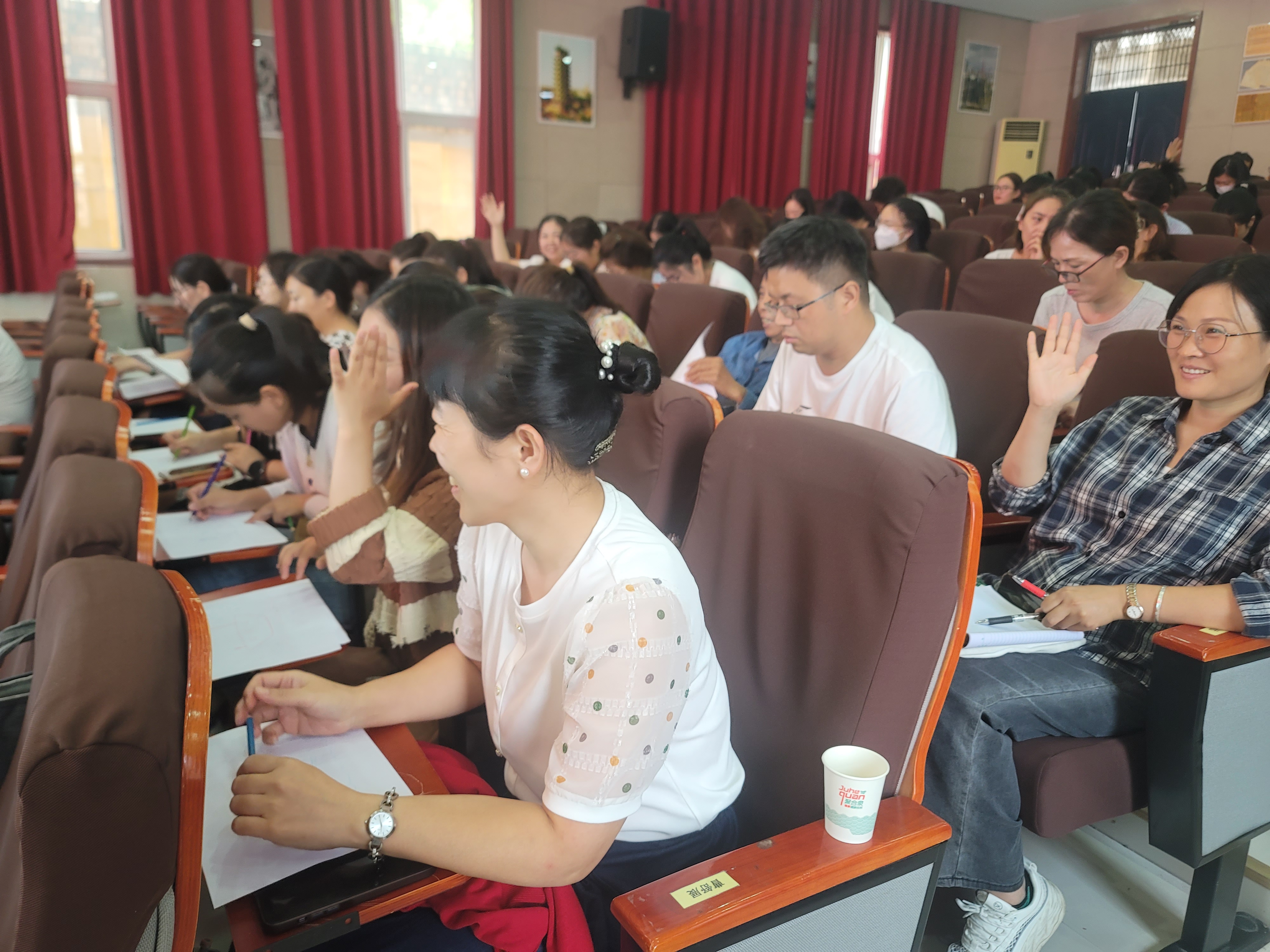 杨老师首先从心理危机诱因、情绪、行为、状态等引导老师进行思考,方便更好注意学生有可能存在的心理问题,及时了解学生的状态,做好心理危机干预。随后重点阐述了积极心理学在解决学生心理问题方面的独特作用和应用策略,强调培养学生的积极情绪、积极人格特质以及构建积极的社会支持系统的重要性。深入浅出地分析了学生常见的心理问题,如学习焦虑、人际交往困扰、情绪波动等,并指出这些问题对学生成长和学习可能产生的负面影响。同时,以案例形式分享了一系列实用的心理干预技巧和方法,如积极心理暗示、成长型思维培养、感恩教育等,引导教师们从积极的视角去发现和激发学生内在的心理潜能。现场教职工全神贯注,边听边思考,在不断回顾自身经历与体验的过程中,内化并强化自身的教育能力,力求在今后的教育教学中能够更出色地满足学生的多元需求。