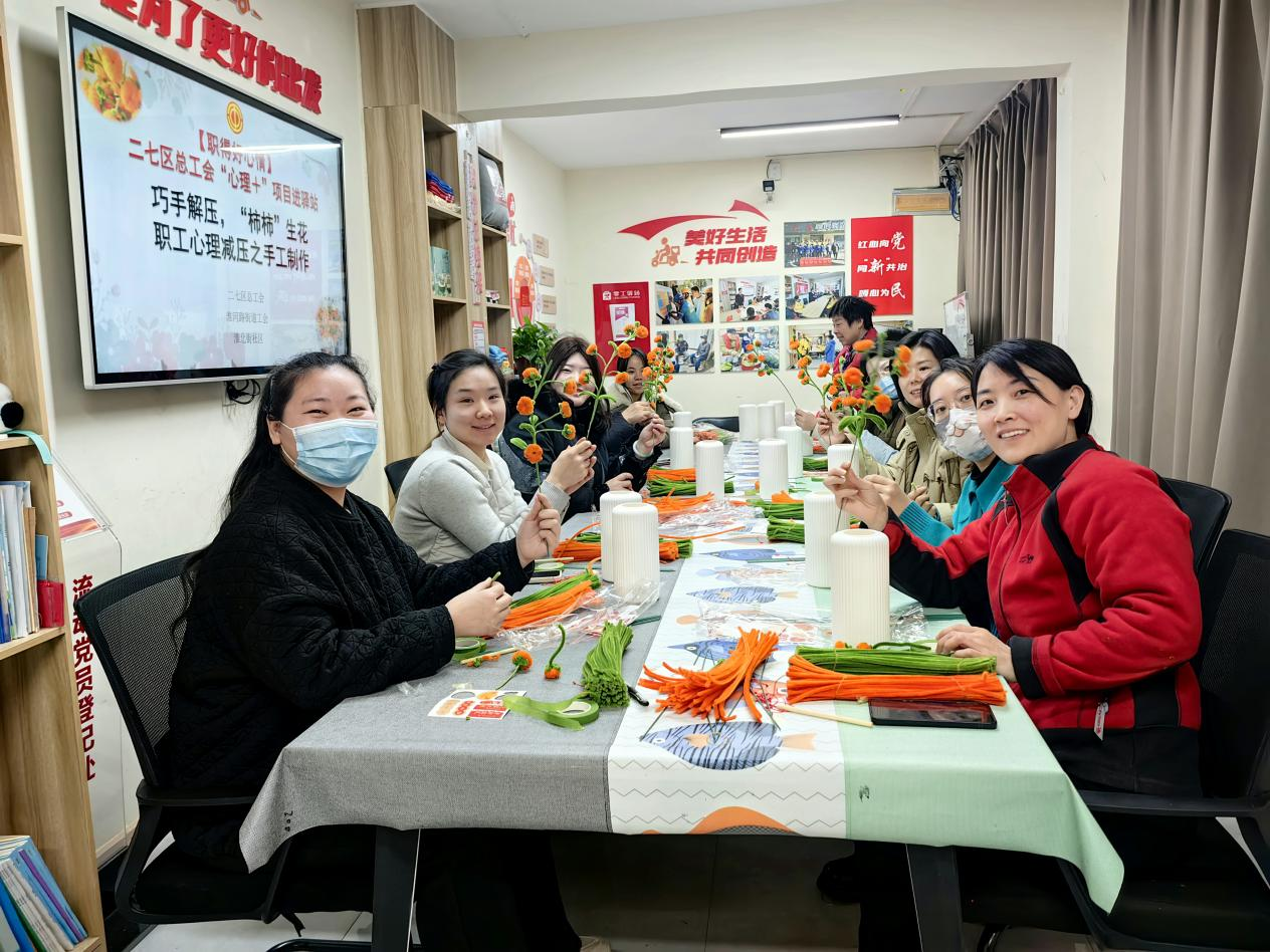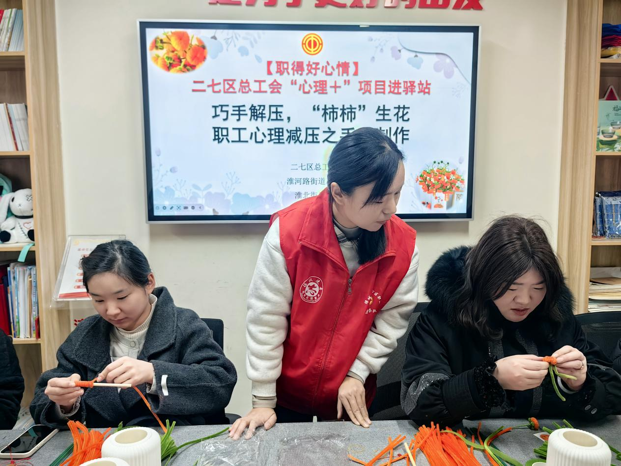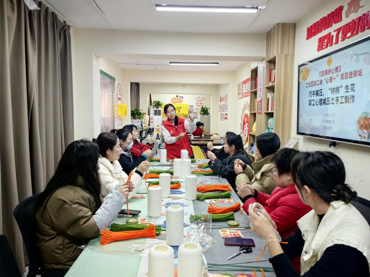 为缓解职工工作压力,丰富职工业余文化生活,1月15日,二七区总工会联合淮河路街道工会在淮北街社区工会驿站精心组织“巧手解压,‘柿柿’生花”扭扭棒柿子花束制作活动,通过“心理十手工”的方式,让职工们能够放松心情,实现心理减压。