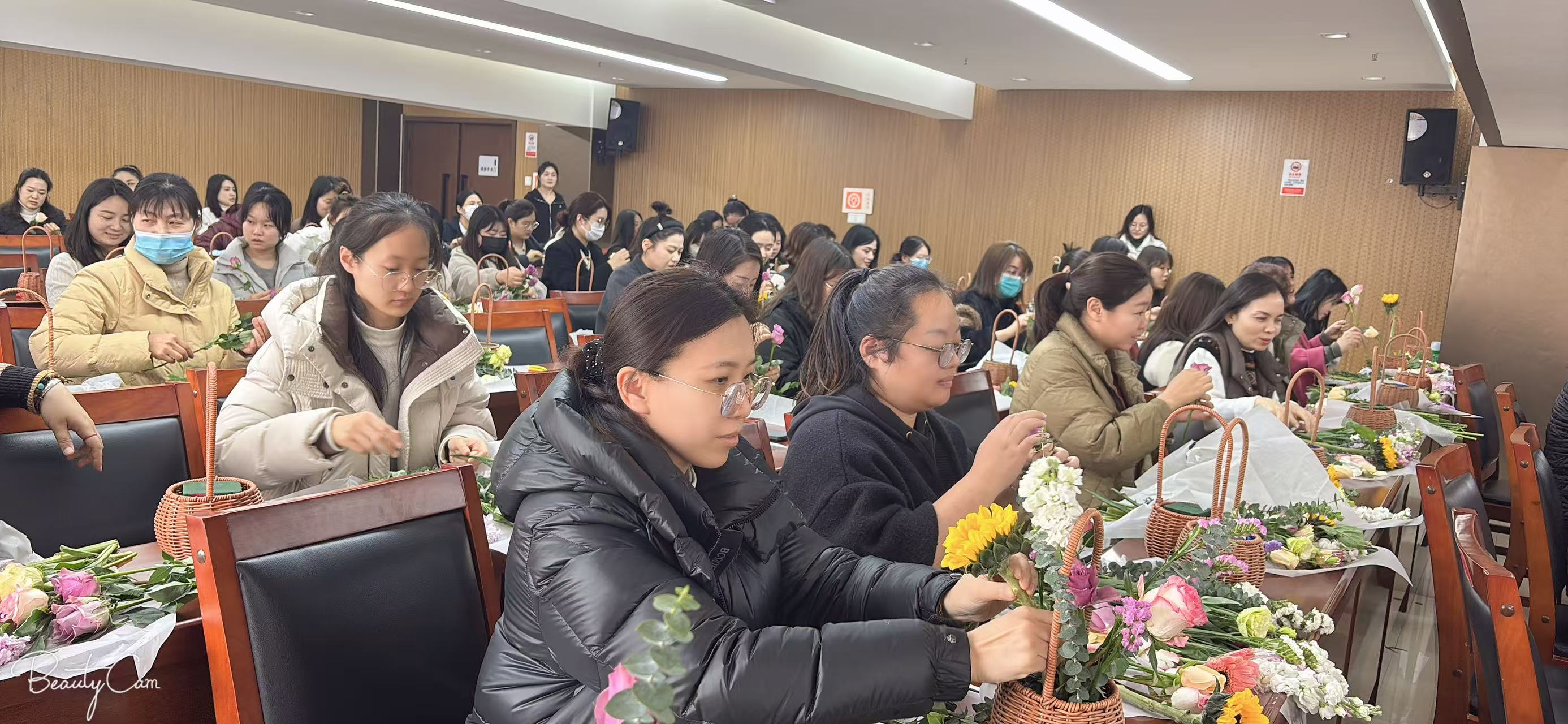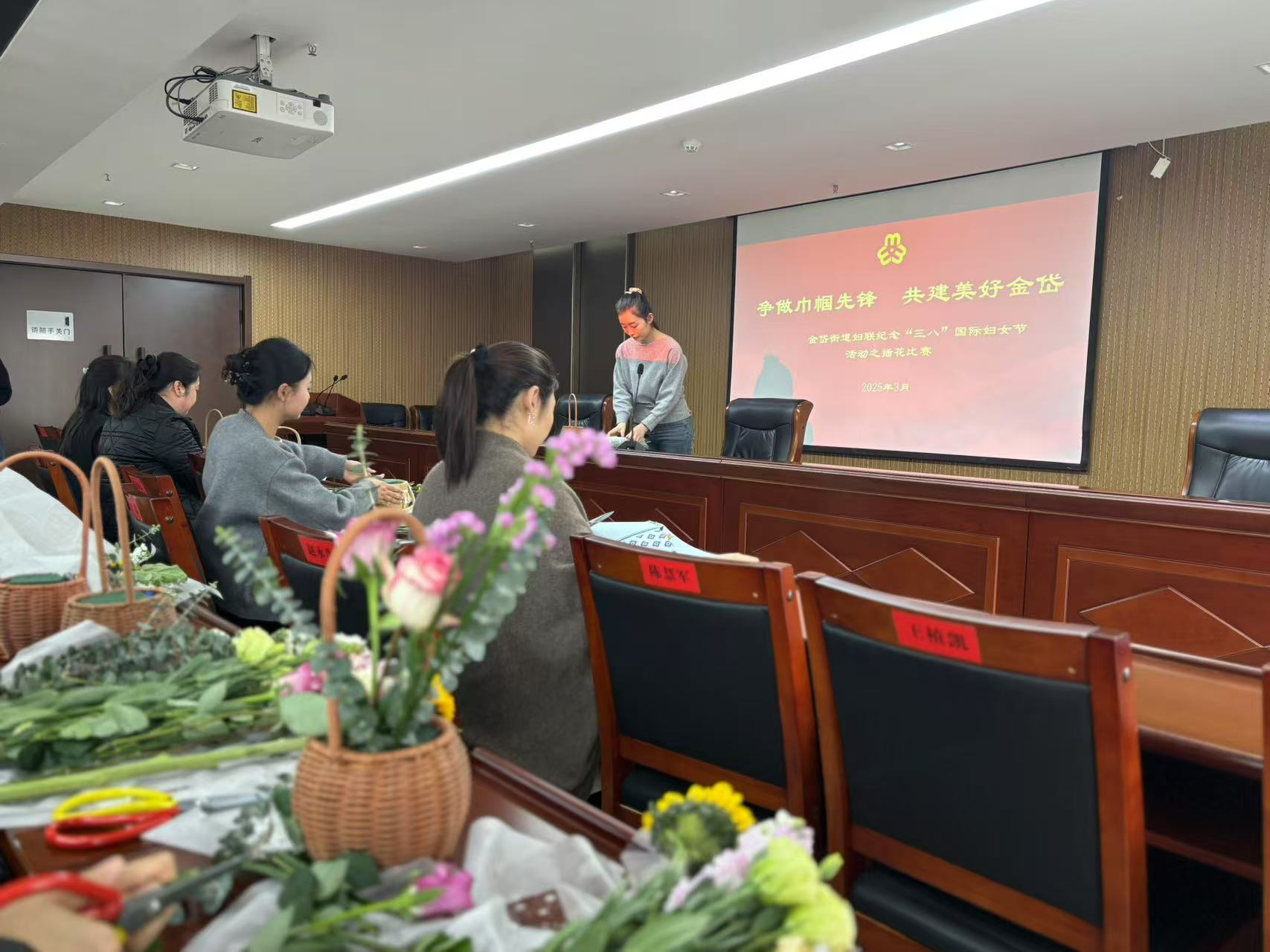 活动现场,花香四溢,五彩斑斓的花材整齐摆放,玫瑰娇艳欲滴,向日葵充满活力,康乃馨温馨柔美。专业花艺师首先为大家细致讲解了插花的基本技巧,从花材的选择与搭配,到构图的设计与层次,女职工们听得全神贯注,不时点头。