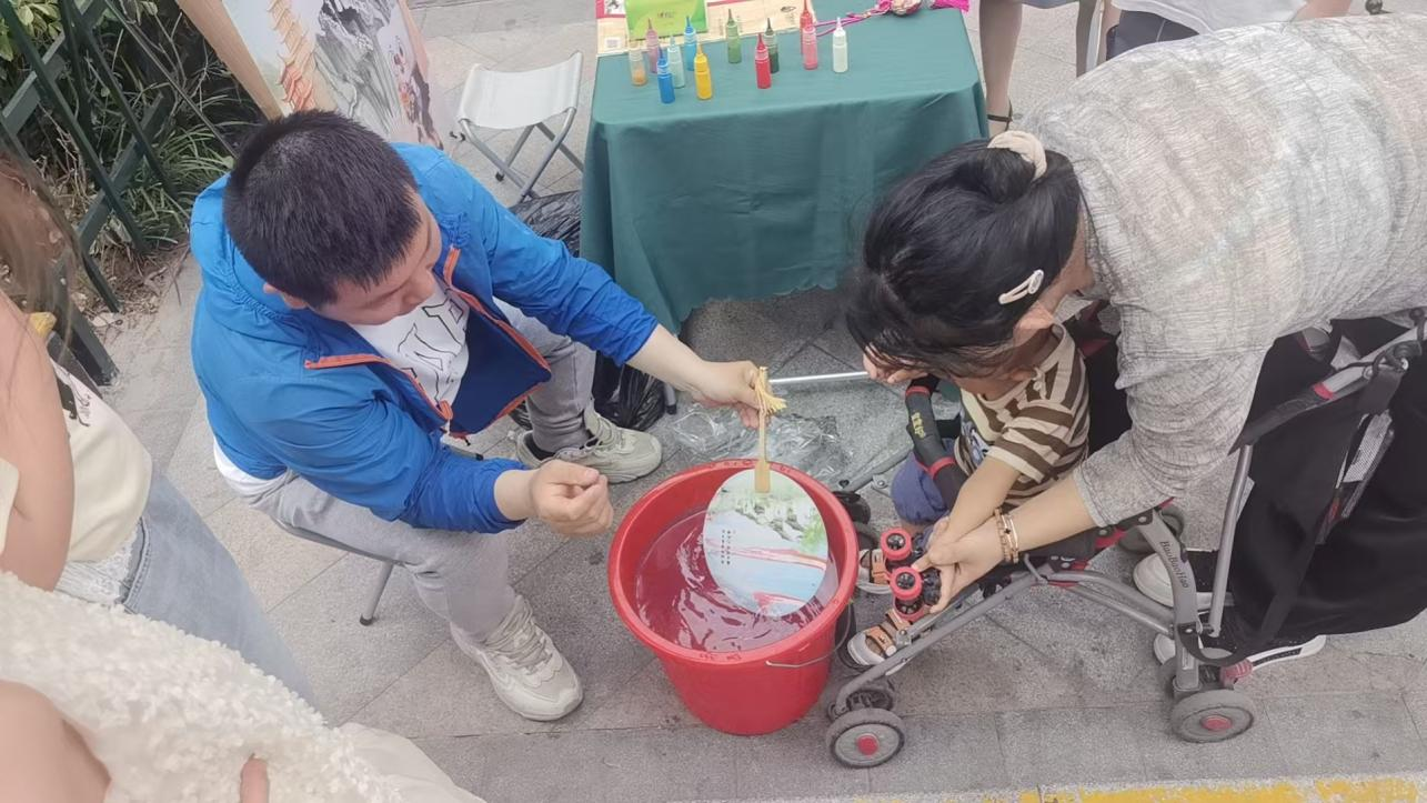 漆扇是在传承非遗髹饰技艺的基础上,利用“漂漆”技法,以水为媒、漆为色,利用大漆不溶于水且具有流动性的特点,进行艺术创作的一种创新技法。活动现场,老师为大家讲解了漆扇的起源、文化内涵和制作过程,详细介绍了制作中的注意事项,让现场青少年深刻体会到了漆艺的艺术性和复杂性。在老师的指导下,大家踊跃参与,自己挑选配色、调整角度下水,通过漆料在水面的自然流动与人工干预结合,形成独一无二的纹理,旋转沉浮间一把把漆扇制作完成,将自然流体之美定格于方寸扇面间。