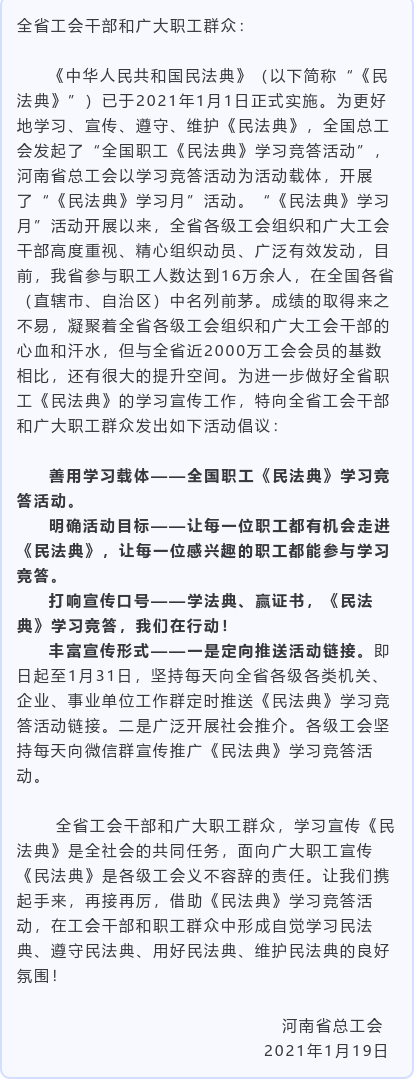 在全省工会干部和职工群众中广泛学习宣传《民法典》的倡议书