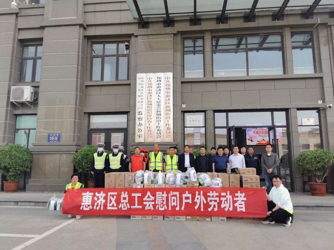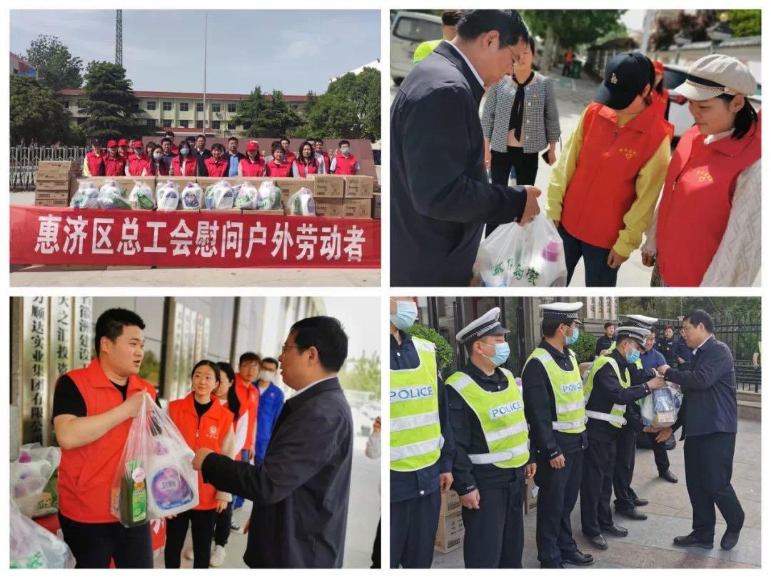 “五一”将至,惠济区人大常委会副主任、区总工会主席袁加军带领区总机关工作人员,深入到古荥镇、花园口镇、大河路办事处、新城办事处、迎宾路办事处五个沿黄镇(街道)开展慰问户外劳动者活动,为1000名户外劳动者送去了价值10万元的洗衣液、肥皂、香皂、毛巾等慰问品,并向他们致以节日的问候。