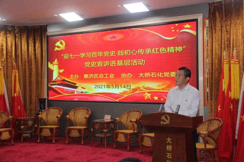 为充分发挥工会组织引导职工群众的重要作用,推动党史学习教育深入群众、深入基层、深入人心。5月14日,惠济区总工会在大桥石化红色家园开展以“迎七一学习百年党史·践初心传承红色精神”为主题的党史宣讲进基层活动,全区各基层工会代表60余人参加。