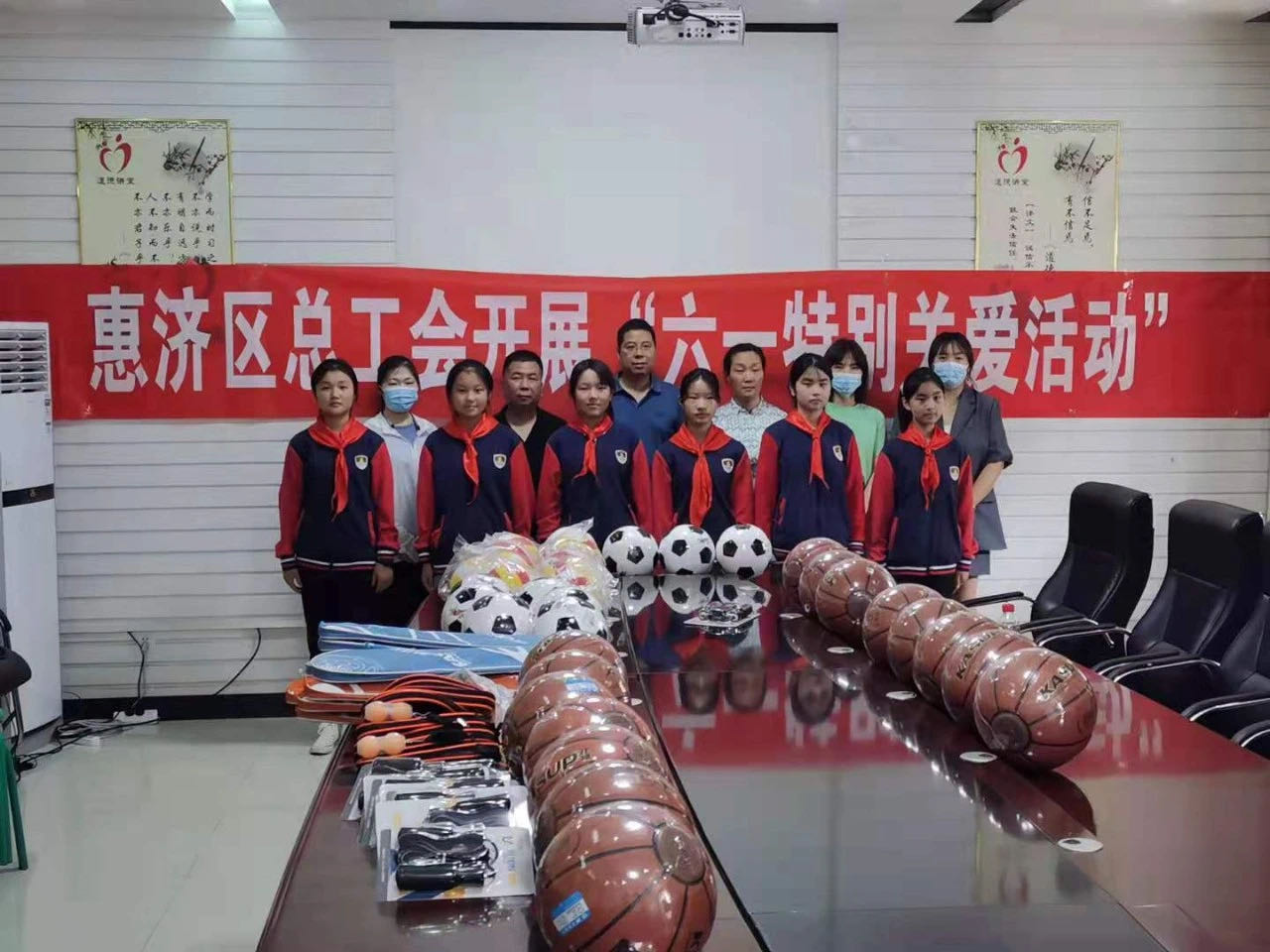 5月31日,区总工会主席袁加军带队到南阳小学和京水回民小学开展走访慰问活动,为学生们送去了篮球、排球、足球、跳绳等体育用品,并向孩子们送上了节日祝福,勉励他们勇敢追寻梦想、努力学习,自强自立,以优异的成绩回报亲人、回报社会、回报祖国。