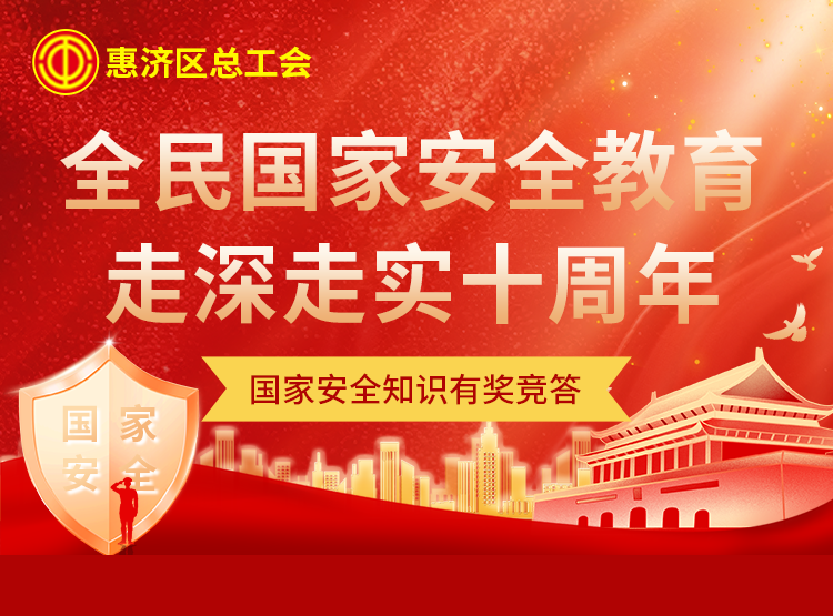 今年4月15日是第十个全民国家安全教育日,为进一步强化全区广大职工的国家安全意识,牢固树立总体国家安全观,惠济区总工会于决定“全民国家安全教育 走深走实十周年”为主题的国家安全知识有奖竞答活动。