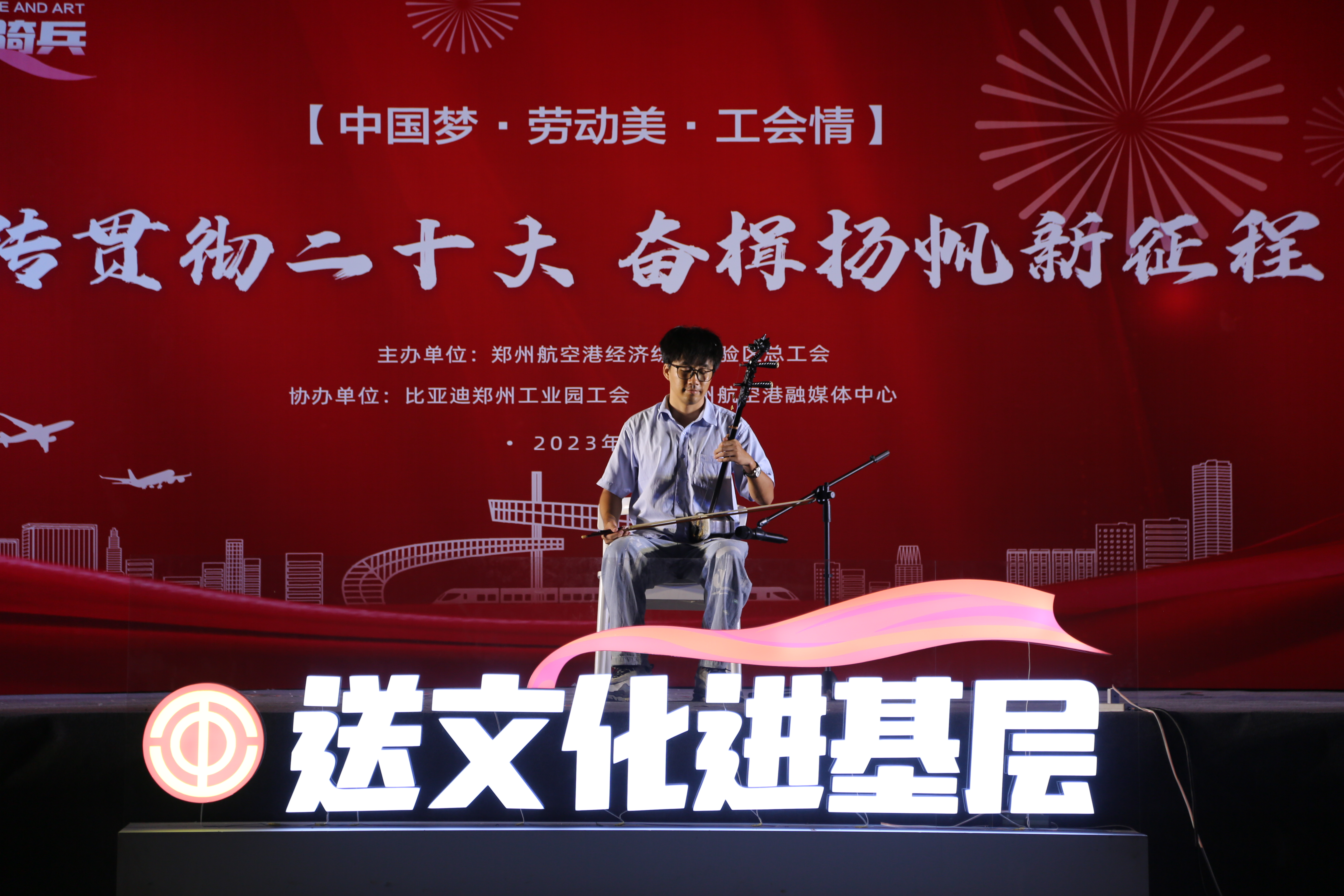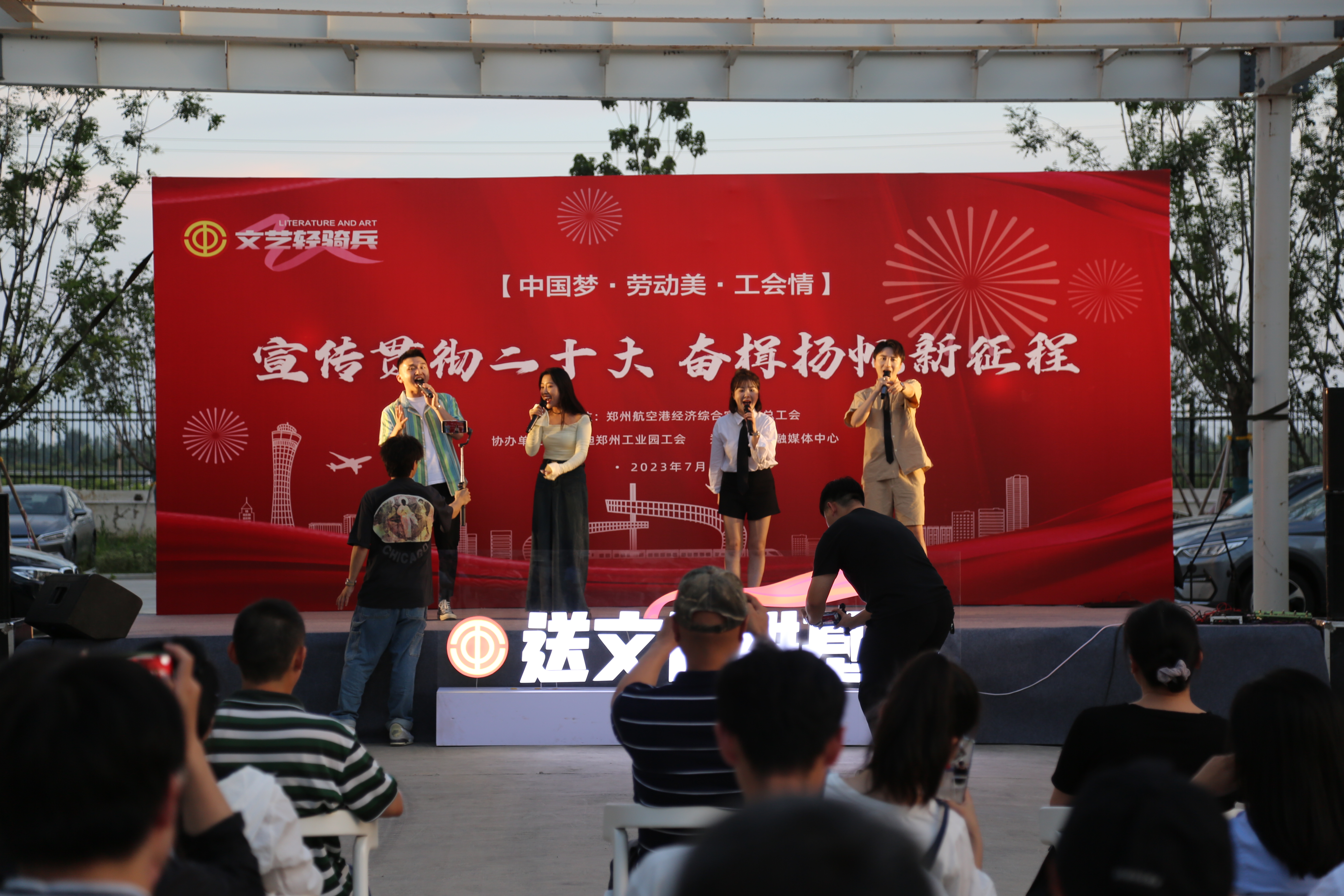 港区哪里有职工,就把文化送到哪里,作为航空港总工会为职工群众突出办好的实事之一,7月27日晚,由郑州航空港实验区总工会主办,比亚迪郑州工业园工会、郑州航空港融媒体中心协办的《中国梦·劳动美·工会情——宣传贯彻二十大 奋楫扬帆新征程》第三场文艺演出在郑州比亚迪一期生活区举行,郑州航空港实验区总工会“文艺轻骑兵”艺术团各位青年演员以及职工代表将歌曲、舞蹈、相声等精彩节目,以文化活动的形式歌颂党的百年光辉,宣传党的二十大精神,展现新时代广大职工群众坚定不移跟党走、昂首奋进新征程的精神风貌。