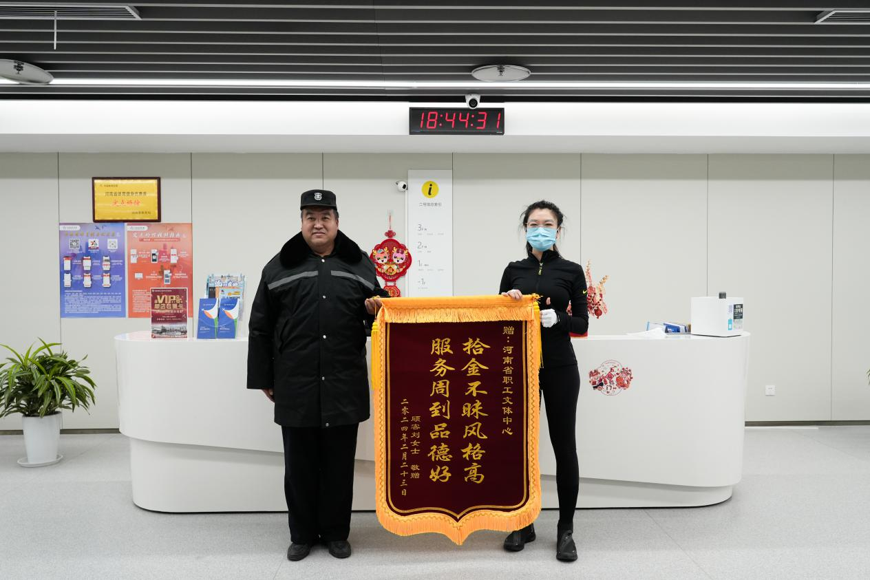 “非常感谢河南省职工文体中心的工作人员,更感谢拾金不昧、工作认真负责的刘县伟同志。”近日,顾客刘女士将一面“拾金不昧风格高 服务周到品格好”的锦旗送到了省文体中心,字里言间,尽显赞扬之意。