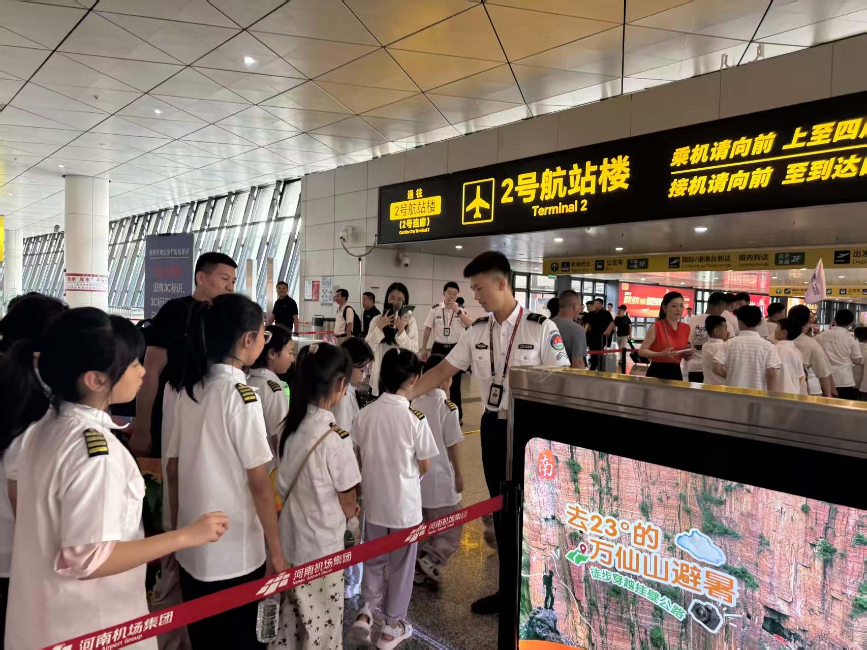 午餐后,孩子们走进郑州机场航空科普研学基地,孩子们穿上飞行员服装,参与值机实操、VR太空遨游,观看模拟火箭发射及飞机起降,在“虚拟航天+真实航空”的立体体验中深入了解民航运营体系,点燃航天梦想。