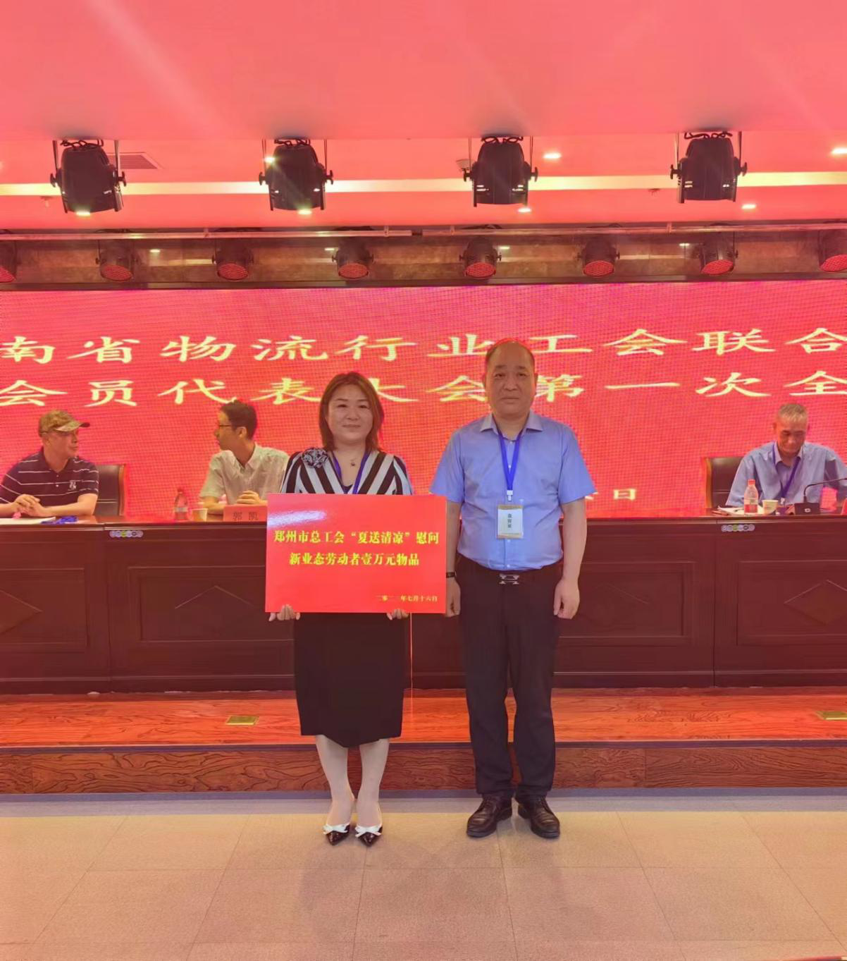 会议结束后齐智慧代表市总机关干部赴基层蹲点工作组第七组向河南物流行业工会联合会赠送了价值一万元的“夏送清凉”新业态劳动者慰问物品。