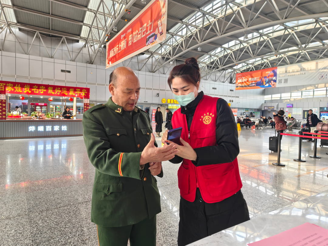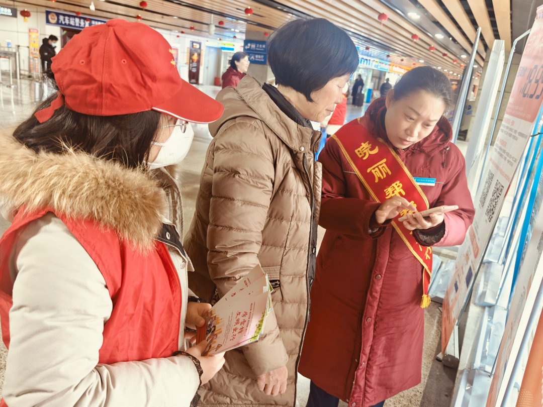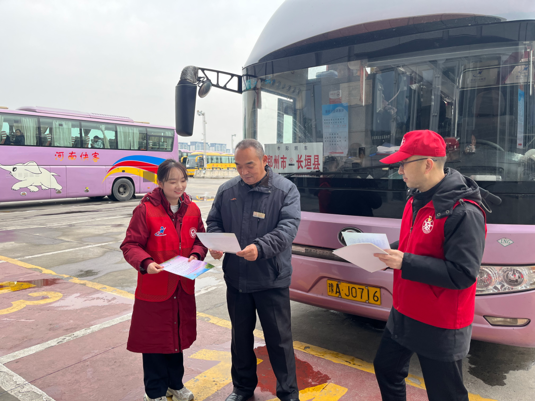 东站“晓丽帮帮”及党团员志愿者们联合中州水务控股有限公司,在电梯口、售票大厅、候车厅,向过往的乘客发放文明出行倡议书,宣传文明出行、安全驾驶;在站点巴士购票专区、自助售票区等地,志愿者们手把手教学,帮助旅客网上购票,遇到不会使用扫码购票的老人,志愿者们也耐心帮扶;在候车大厅,志愿者们主动帮助老人拿大件行李,引导乘客乘车。