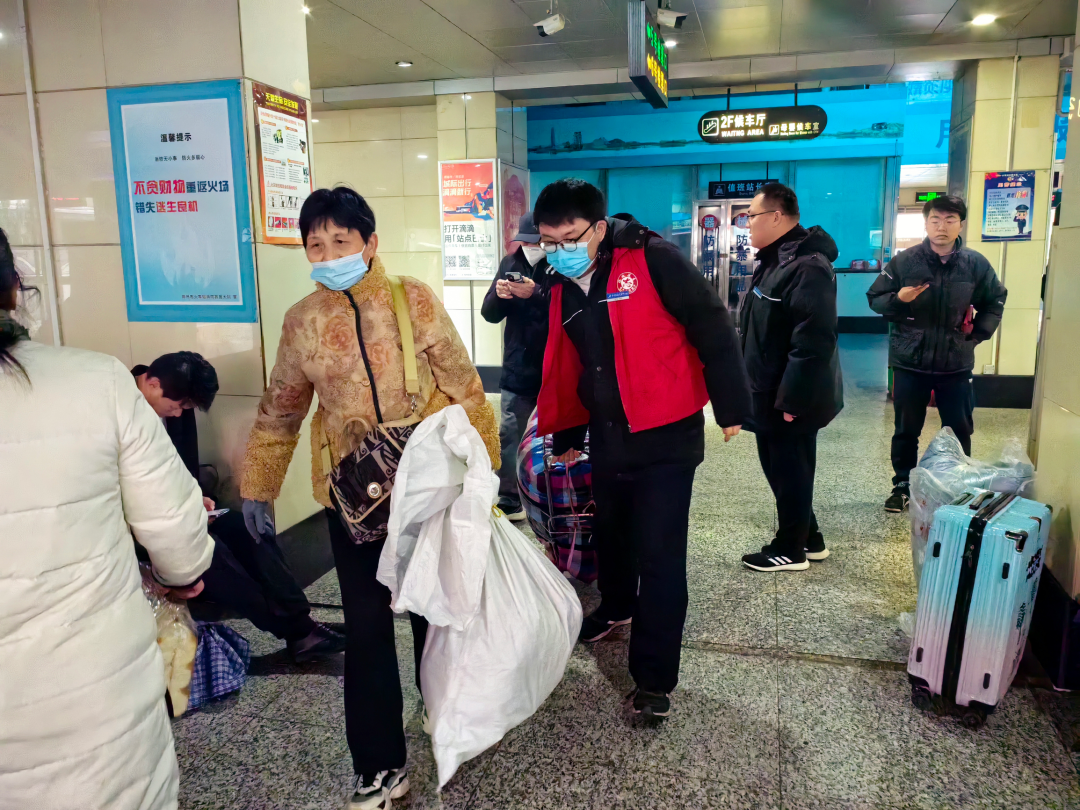 在进站口,“爱心链”服务组成员和青年职工吴增齐手举指示牌,引导旅客有序进站。他们主动上前,帮助旅客搬运行李,尤其是那些携带大件行李或行动不便的旅客,吴增齐更是一路护送,给旅客送上车,确保他们安全坐上车。