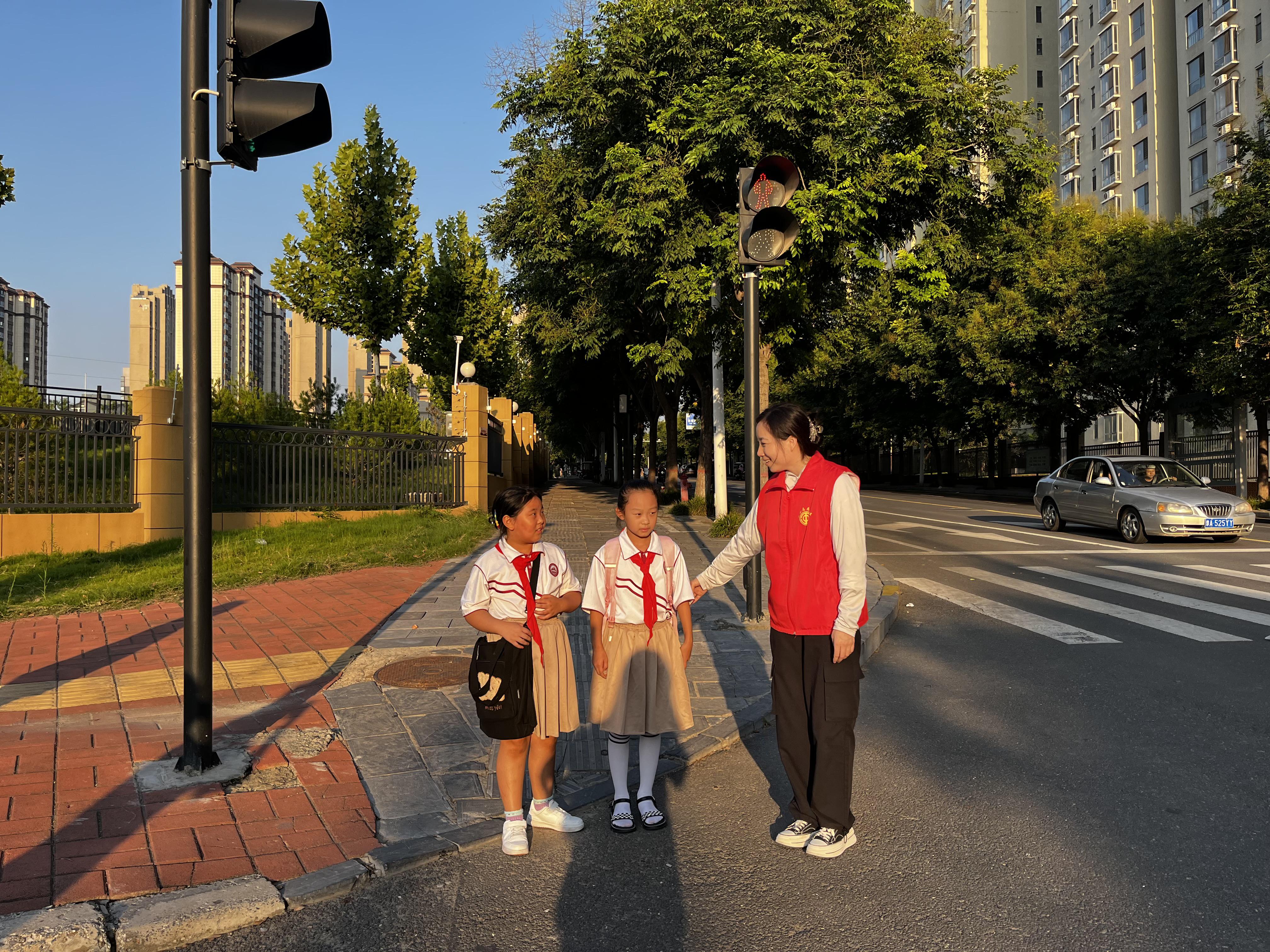 放学之后,志愿者引导学生过马路并提醒过往车辆和家长遵守交通规则,注意避让学生,引导学生在安全区域内行走,教育引导路人遵守交通法规,文明行路、文明行车。