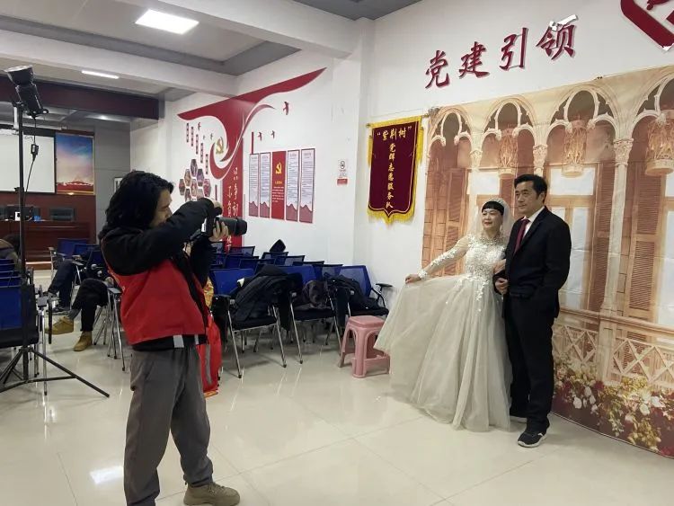 公益摄影活动现场,在志愿者的精心打扮下,阿姨们更换上了漂亮的婚纱、秀禾服等服装,叔叔们穿上帅气的西服。“叔叔阿姨,看这里,嘴稍微闭一点点,保持微笑,再来一张……”活动现场,社区工作人员和志愿者引导着每一位前来拍照的居民有序拍摄,帮助他们打理发型、整理衣服,让他们将最好的状态展现出来。
