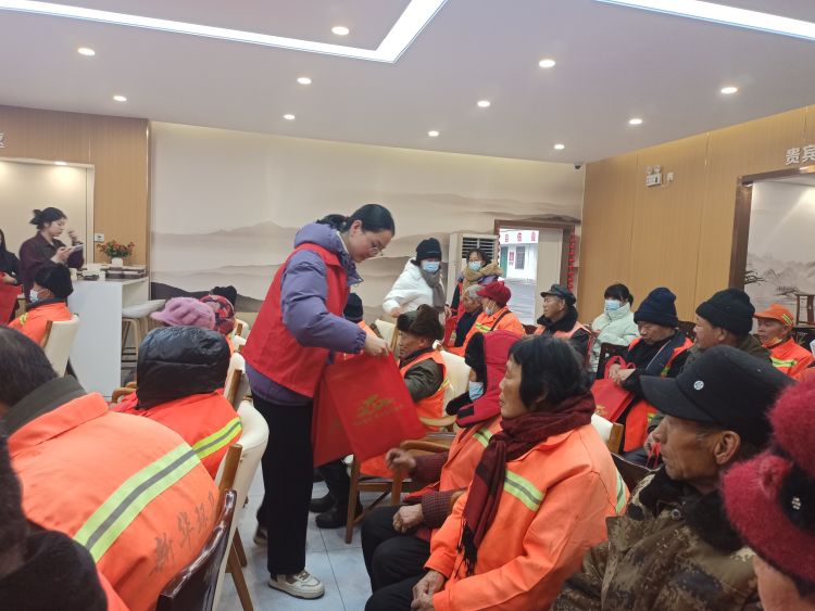 除了暖心粥,文化街社区联合邮政储蓄银行为环卫工们送春联、暖宝宝等暖心物资。
