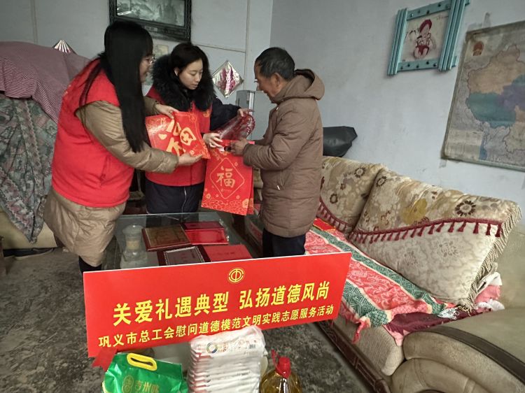 为进一步弘扬中华优秀传统文化,更好的彰显德者有得、好人好报的价值导向,营造全社会关心关爱道德模范和身边好人的浓厚氛围,1月31日在春节来临之际,巩义市总工会志愿者到康店镇黑南村走访慰问河南省乡村光荣榜好丈夫牛治安,向他致以节日的问候和祝福,并送上米面油等慰问品,祝福他在新的一年里身体健康、阖家幸福。