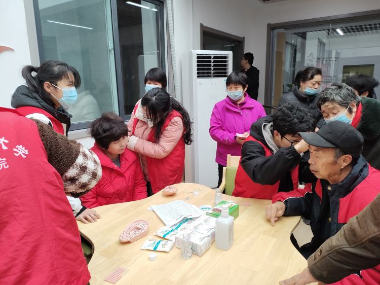 义诊现场,河南中医药大学护理学院师生团队耐心地为前来诊疗的居民免费测量血压、血糖,为有需要的居民进行耳穴压豆和刮痧体验,并通过发放健康宣传资料、宣传手册普及健康知识。