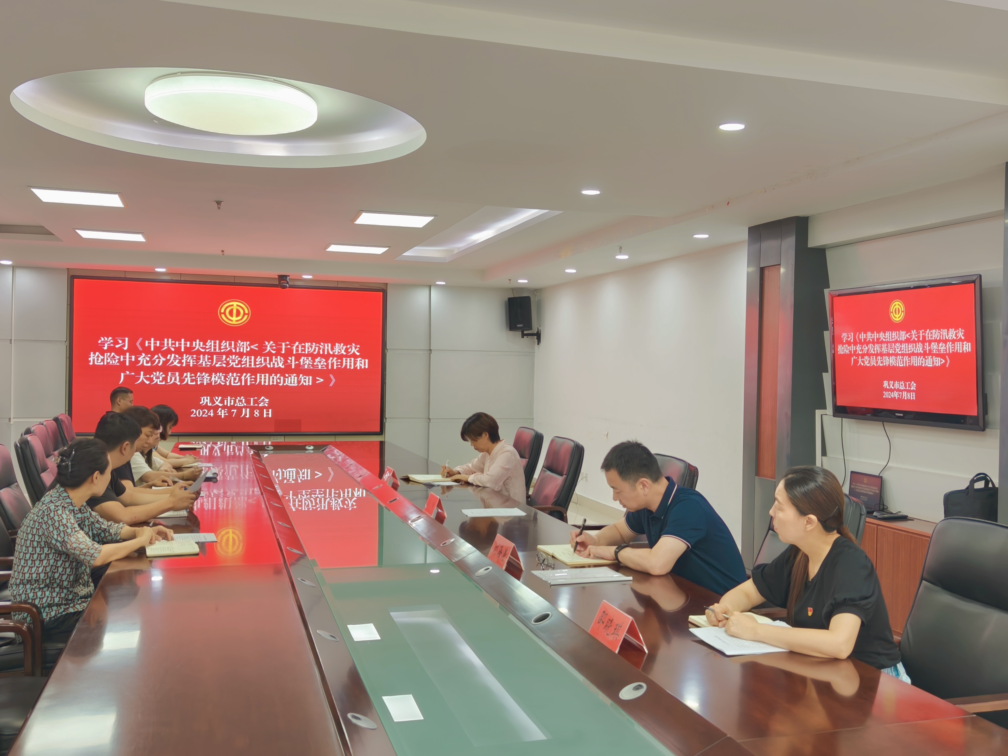为深入贯彻落实习近平总书记关于防汛救灾抢险工作的重要指示精神和市委市政府有关决策部署,动员机关党员干部充分履行工会职能,积极参与防汛抢险救灾各项工作。7月8日,巩义市总工会在三楼会议室集中学习《中共中央组织部<关于在防汛救灾抢险中充分发挥基层党组织战斗堡垒作用和广大党员先锋模范作用的通知>》(以下简称《通知》),市总工会全体干部职工参加。
