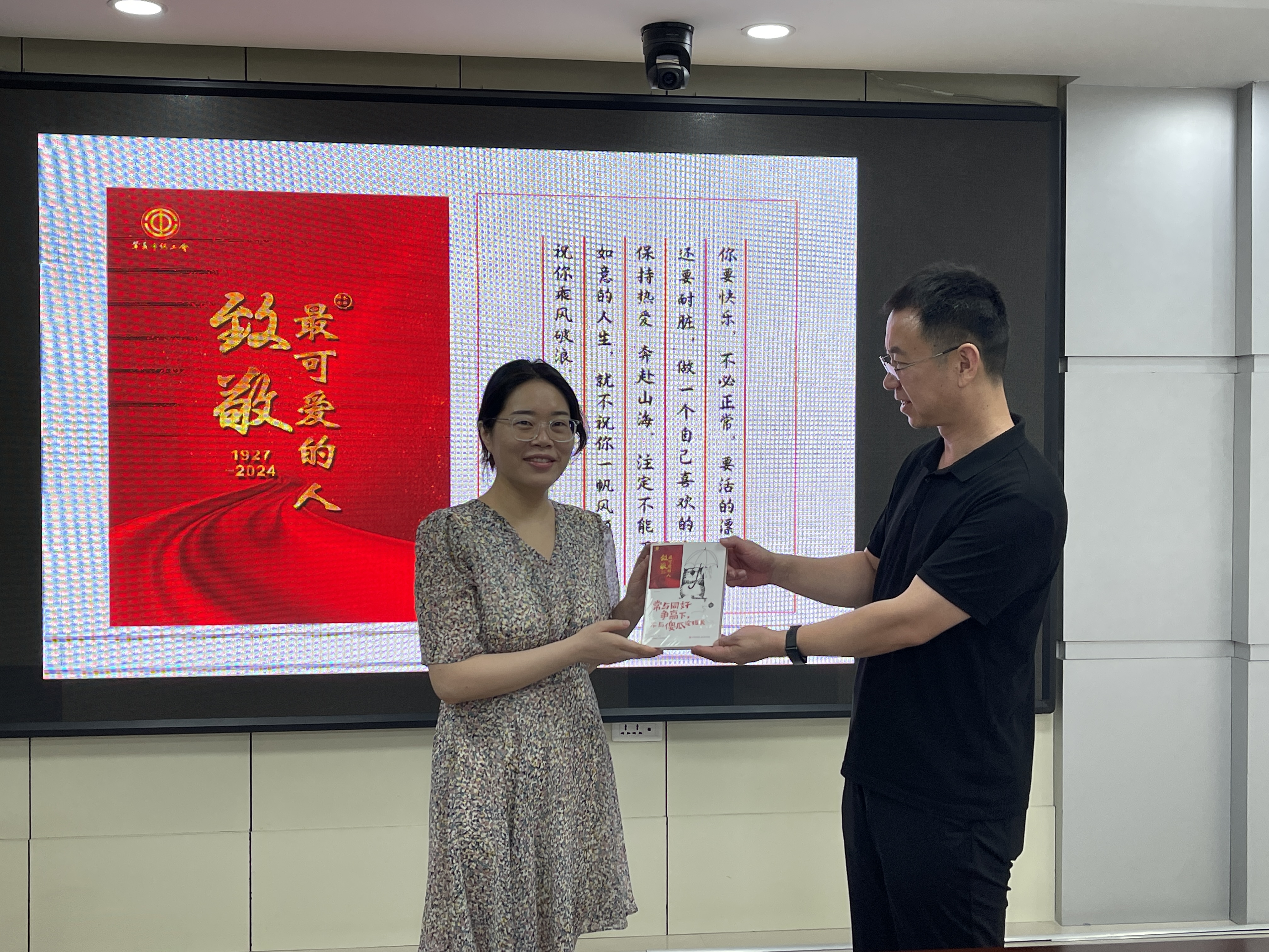 活动中,职工服务中心八级职员邵晓琪为退役军人王飞燕致八一慰问信,韩铮铮同志代表全体干部职工为王飞燕送祝福寄语,最后由职工服务中心主任刘海涛为王飞燕送节日礼物“红色书籍《致敬最可爱的人》”,并感谢她将青春和热血奉献给部队,希望她脱下戎装后在自己的岗位上施展才华,为巩义工运事业发展贡献力量。