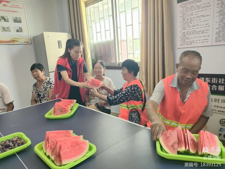 镇东街“工会驿站”工作人员为环卫工人发放仁丹、藿香正气水、纯净水等防暑降温物资,并一起吃西瓜。炎炎夏日送清凉,丝丝关爱入心田。此次送清凉活动,不仅给户外劳动者送去了夏日的清爽和愉悦的心情,也让她们感受到社区的温暖。