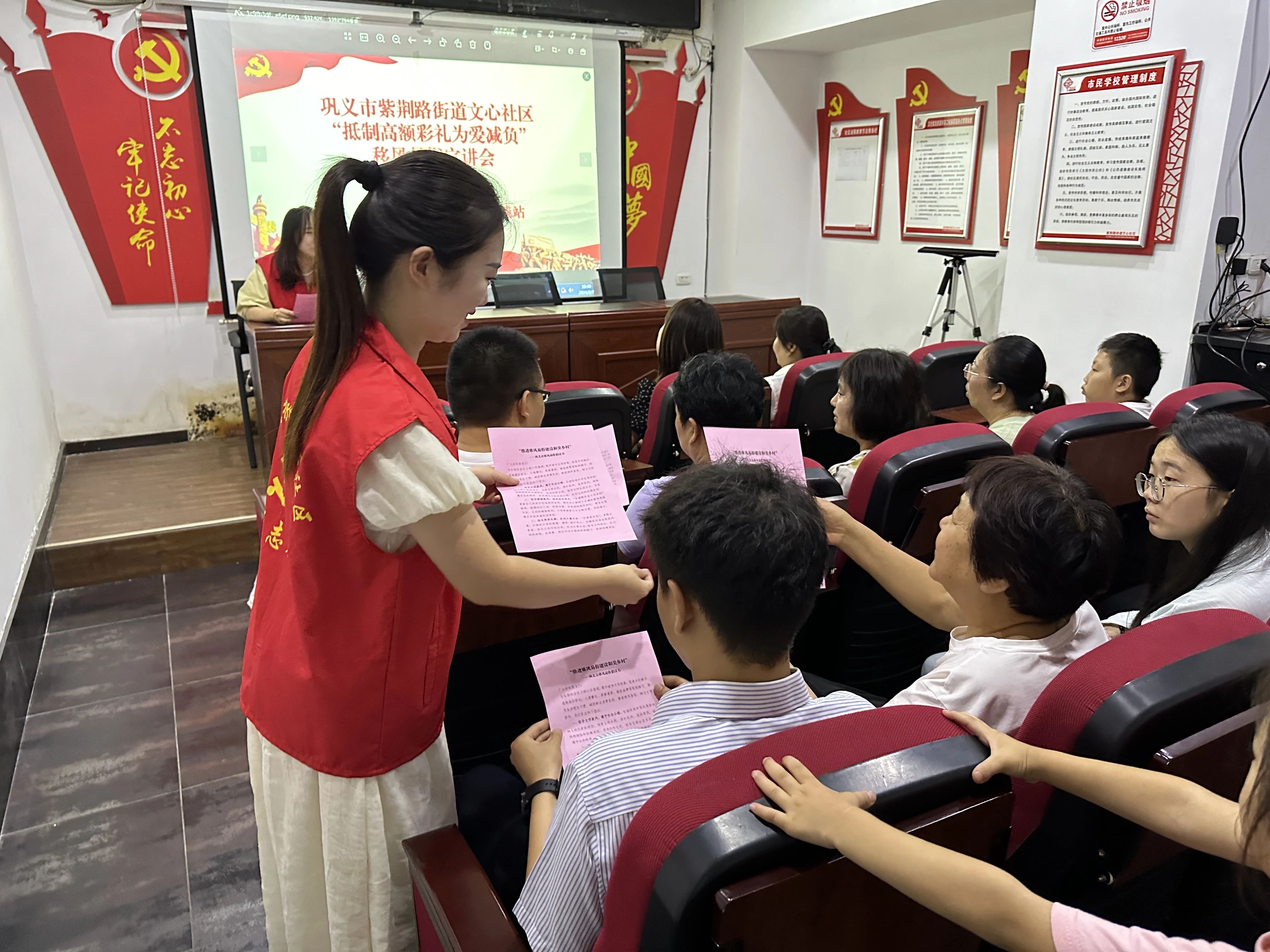 为培育和践行社会主义核心价值观,遏制高价彩礼、人情攀比等不良风气。近日,巩义市紫荆路街道文心社区工会组织辖区居民在新时代文明实践站开展“抵制高额彩礼 为爱减‘负’” 移风易俗宣讲会。