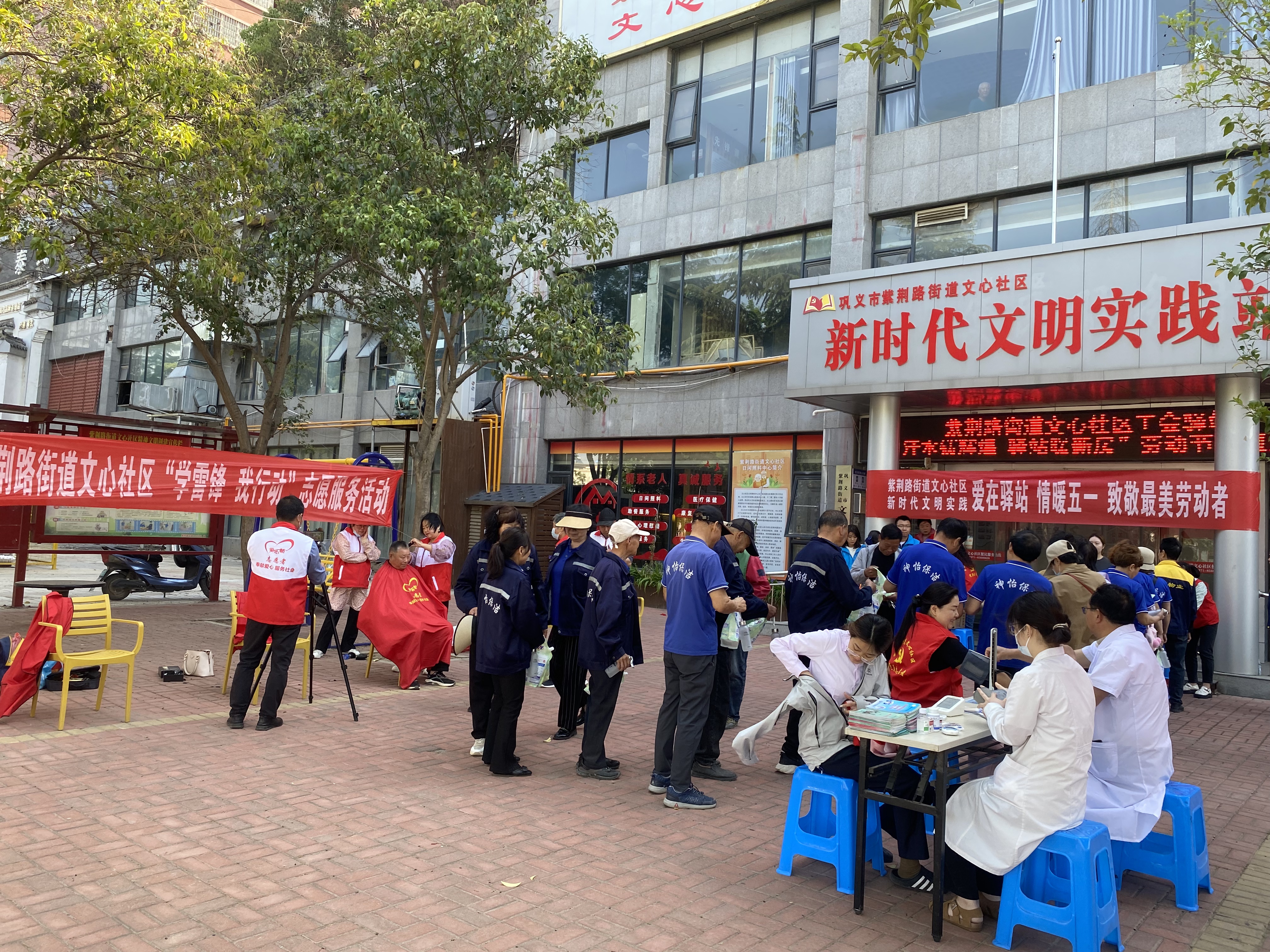 在文心社区工会驿站,社区卫生服务站的医护人员正在为前来咨询和检查的环卫工人、园林工人、小区保洁员等一线劳动者量血压、测血糖等,并细致地解答疑问,为大家讲解常见疾病的预防知识及养生知识。巩义市“爱心桥”学雷锋志愿服务队也组织爱心理发师来到现场,为劳动者提供义务理发服务。此外,文心社区还为每位劳动者准备了洗衣液、水杯等劳动节纪念品,表达对他们辛勤付出的感谢与尊重。