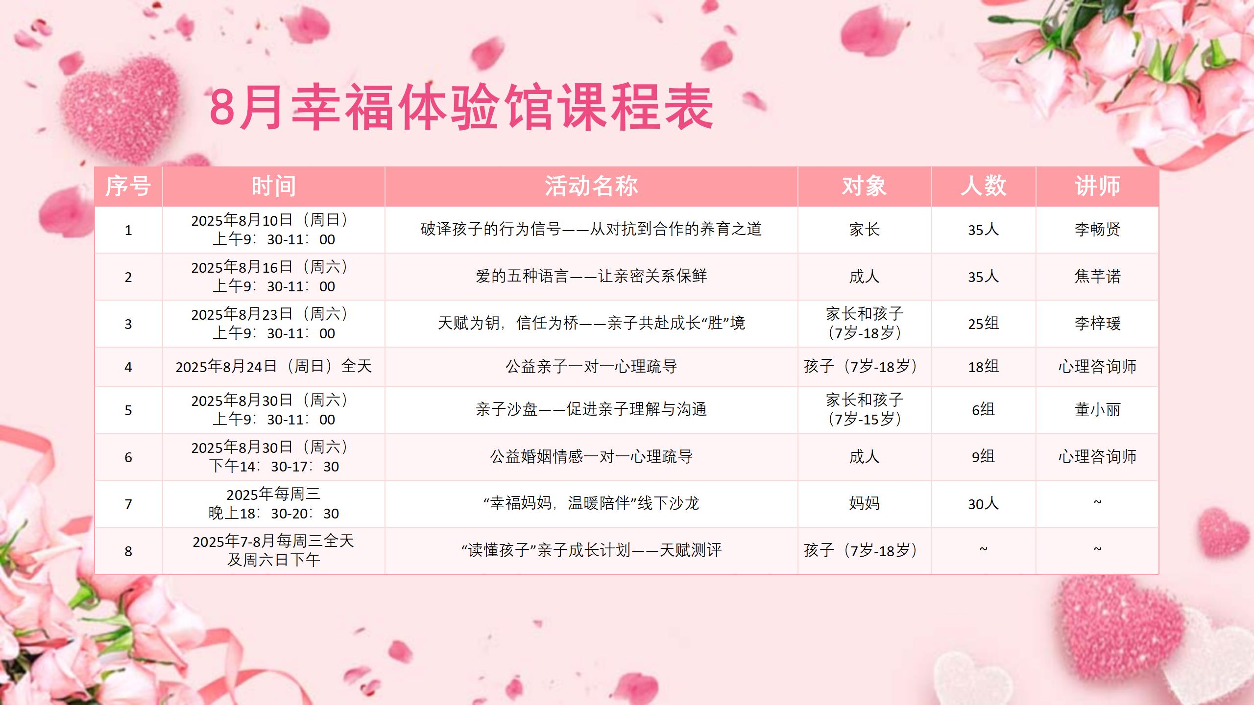 四、月末周持续加持,公益亲子一对一咨询。8月24日,暑假结束,新学期来临之前,让我们充满电,再出发,以积极的家庭和亲密关系迎接新学期的到来!