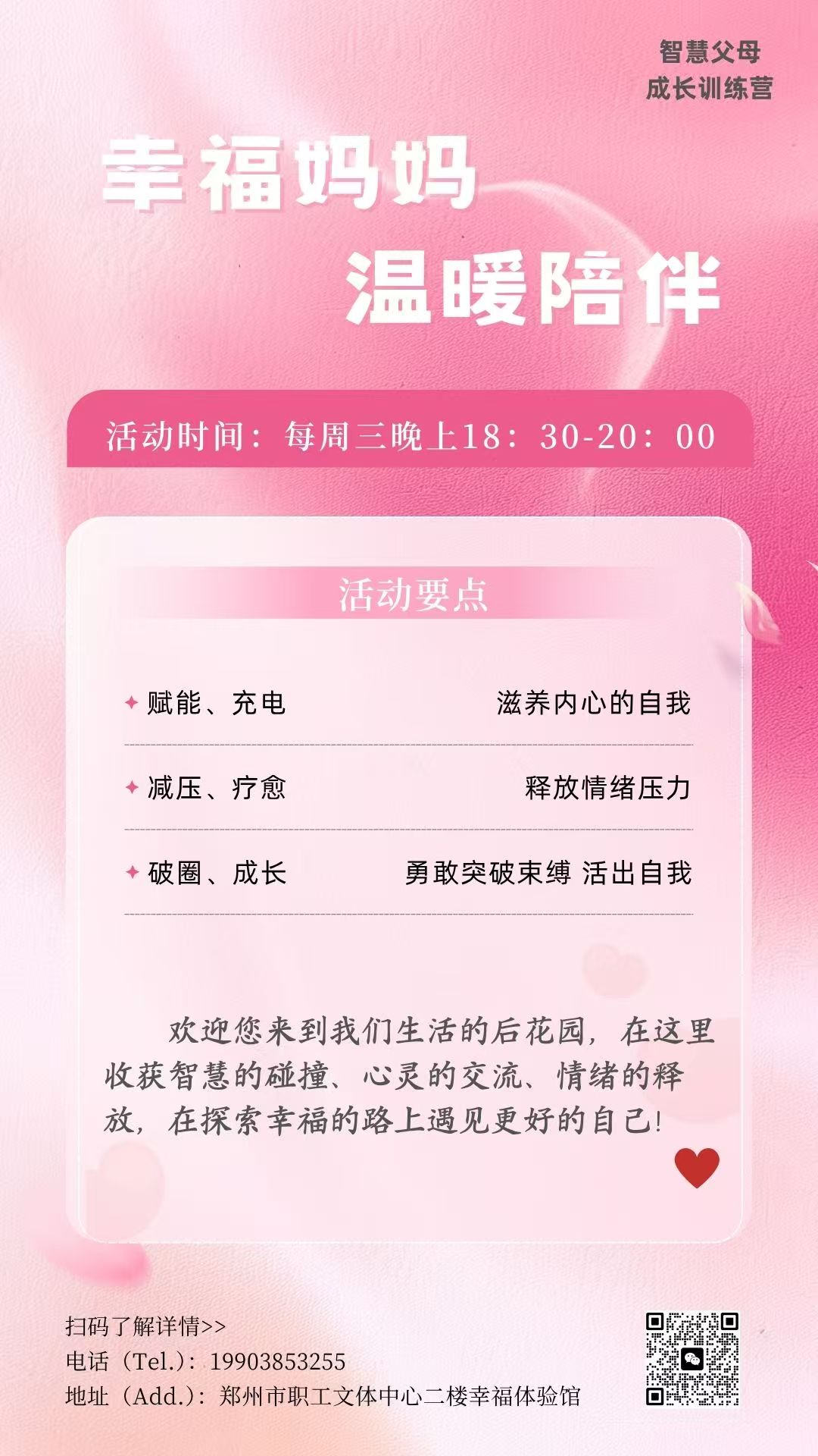 三、幸福妈妈课堂系列活动:每周三晚上,在幸福体验馆相遇 ,从“愈见幸福”到“传递幸福”,生动诠释“幸福是可传递的能量”。在这里不仅成为更智慧的妈妈,也遇见更丰盈的自己,并将幸福理念传递给更多人。