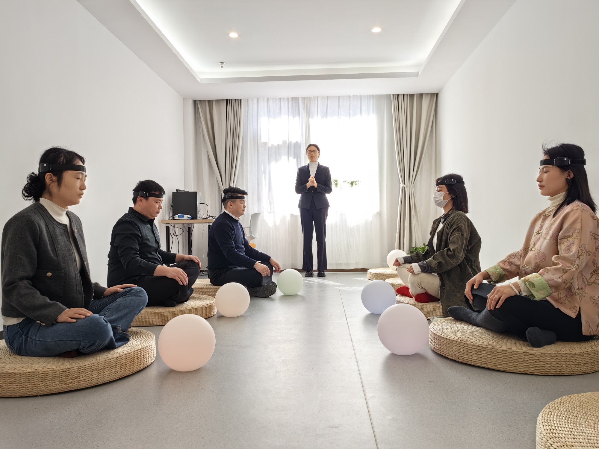 大家按照工作人员的引导,相继体验了“微笑打卡”“心花怒放”“动感单车”等项目,用心感受着专业、系统、多样化的心理健康服务,不时传来一阵阵欢笑声和惊呼声。走进正念减压室,一地白色的圆球瞬间引起了大家的注意,在工作人员的指导下,大家纷纷戴上头带,随着脑电波通过无线设备的传输,每个人手中的白球变成了不同的颜色。工作人员讲解说,球的颜色显示了每个人当前的脑电波情况,紫色代表紧张,青色代表平和,蓝色代表放松。在心理辅导师的语言引导下,大家通过身心合一的冥想,在舒缓的环境中完全放空自己,沉浸体验,最终大家手里的球全部变成了蓝色。这样的体验非常有利于职工释放心理压力,缓解焦虑,达到一个最佳的精神状态。
